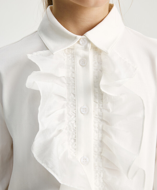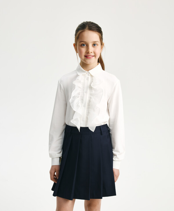 Блузка с длинным рукавом молочного цвета – элегантный акцент школьного гардероба. Блузка прямой свободной формы выполнена из мягкого хлопкового трикотажного полотна с эластаном, дарящего ощущение легк... Показать описаниеости, свежести, комфорта в течение дня. Центральная часть украшена чередой мелких текстильных рюшей, придающих школьным комплектам с ней нотку романтики. Молочная блузка для школы гармонично сочетается и с классическими юбками и брюками, и с модными трубами, и с палаццо, легко вписываясь как в строгие, так и в более непринужденные образы. Блузка застегивается на кнопки. основная ткань 95% хлопок,5% эластан; отделочная ткань 80% вискоза,20% полиэстер