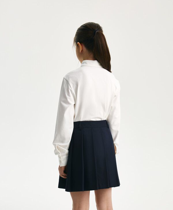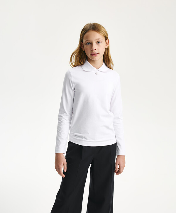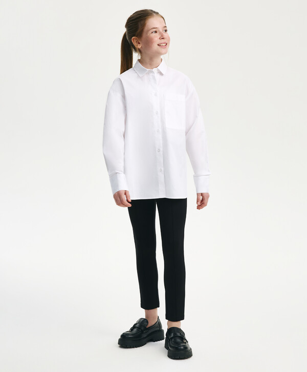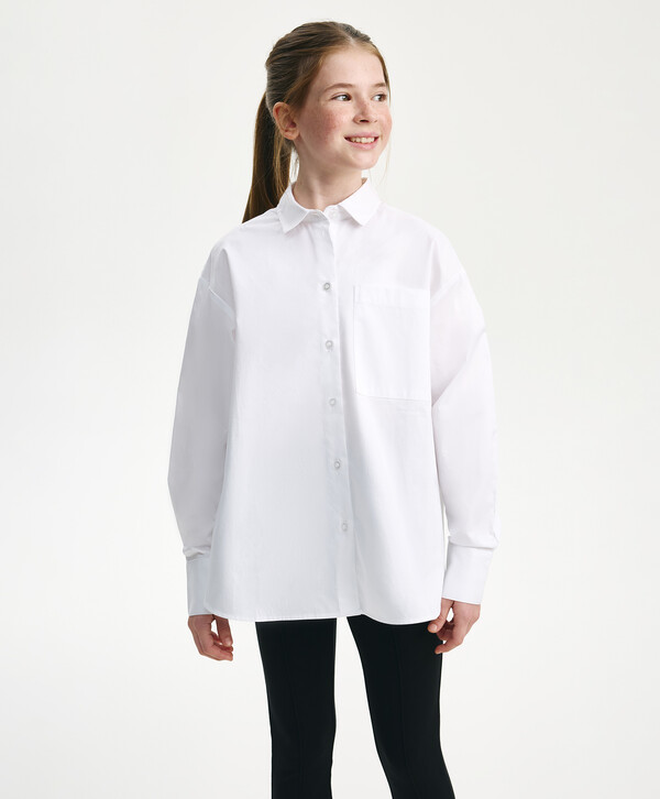 Белая школьная блузка с длинным рукавом – прекрасный выбор для создания модных, современных, элегантных образов девочки. Удлиненная блузка силуэта умеренный оверсайз с заниженной линией спинки выполне... Показать описаниена из легкого хлопкового текстиля, комфортного в эксплуатации и уходе. Форма модели обеспечивает свободу движений, создает современные пропорции в образе. Крупный накладной карман подчеркивает минималистичность дизайна, делая блузку образцом стильной вещи для школы и свободного времени. Белая блузка прекрасно сочетается с классическими брюками, текстильными и трикотажными брюками-палаццо, джеггинсами, кюлотами и другими предметами подросткового гардероба. 100% хлопок
