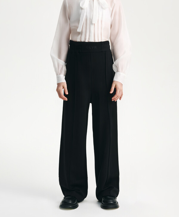 Черные трикотажные брюки палаццо с поясом на резинке —модное и красивое решение и для школьного гардероба, и для свободного времени. Это тот самый универсальный низ, который с любым плечевым изделием ... Показать описаниевыглядит нарядно, элегантно, изысканно. Брюки выполнены из мягкого шелковистого джерси на основе вискозы, прекрасно держащего форму и очень комфортного в эксплуатации. Высокая посадка и струящаяся пластика трикотажного полотна придают образу аристократичность. Застроченные стрелки на передней части подчеркивают строгие деловые ноты в имидже девочки, а также препятствуют вытягиванию изделия в коленной зоне. Школьные брюки имеют карманы в боковых швах. В оформлении модели использован неброский шрифтовой принт. 68% вискоза,28% нейлон,4% эластан