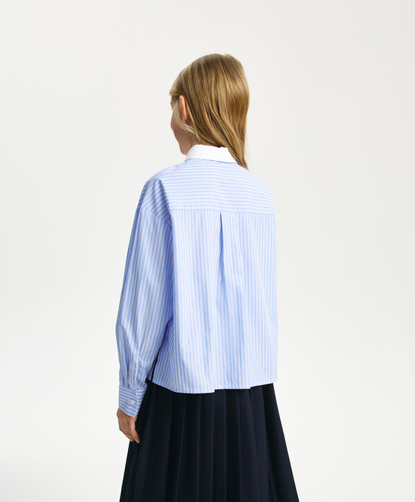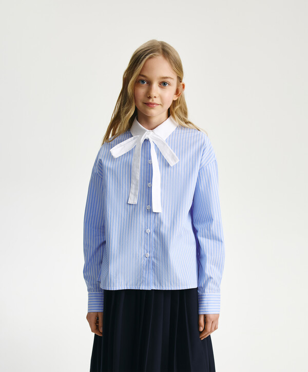 Голубая блузка в полоску с длинным рукавом—прекрасная возможность разнообразить школьные образы. 100% хлопковый текстиль делает блузку приятной к телу, простой в эксплуатации и уходе. Белый воротник с... Показать описание акцентным бантом-галстуком, который проходит через шлевку на стойке, а также вертикальные защипы на полочке придают образу ученицы нарядный вид. И с бантом, и без него, голубая блузка выглядит очень деликатно и интеллигентно. Она отлично сочетается с сарафанами, юбками и брюками, легко адаптируясь к любым школьным комплектам. Блузка застегивается на пуговицы. основная ткань 100% хлопок; отделочная ткань 100% хлопок