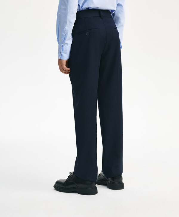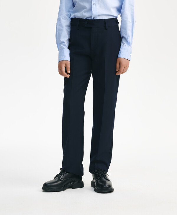 Элегантные классические брюки для школы неотъемлемый атрибут. Прямые синие брюки прекрасно впишутся и в нарядные, и в повседневные образы, подчеркнув строгость, лаконичность, деловые ноты в характере ... Показать описаниемальчика. Брюки выполнены из гладкой костюмной ткани с добавлением натуральной шерсти, на шелковистой вискозной подкладке на передней части. Важнейшая деталь модели - умная система регулировки пояса, позволяющая скорректировать его объем для мальчиков разного телосложения. Карманы со скосами, функциональные задние карманы-листочки и традиционная застежка на молнию, пуговицу и крючок создают удобство в эксплуатации вещи. Брюки прекрасно сочетаются с сорочками, водолазками, поло, любыми изделиями из вязаного трикотажа, создавая стильные и интеллигентные школьные образы. Их можно дополнить пиджаком или жилетом из аналогичной ткани, создав костюмы: двойки, тройки. Важно: брюки не подшиты по нижнему краю. Это позволяет самостоятельно, с помощью специальной ленты, прилагающейся к изделию, или иным способом придать брюкам нужную длину в зависимости от роста ребенка. верх 67% полиэстер,27% вискоза,6% шерсть; подкладка 53% вискоза,47% полиэстер