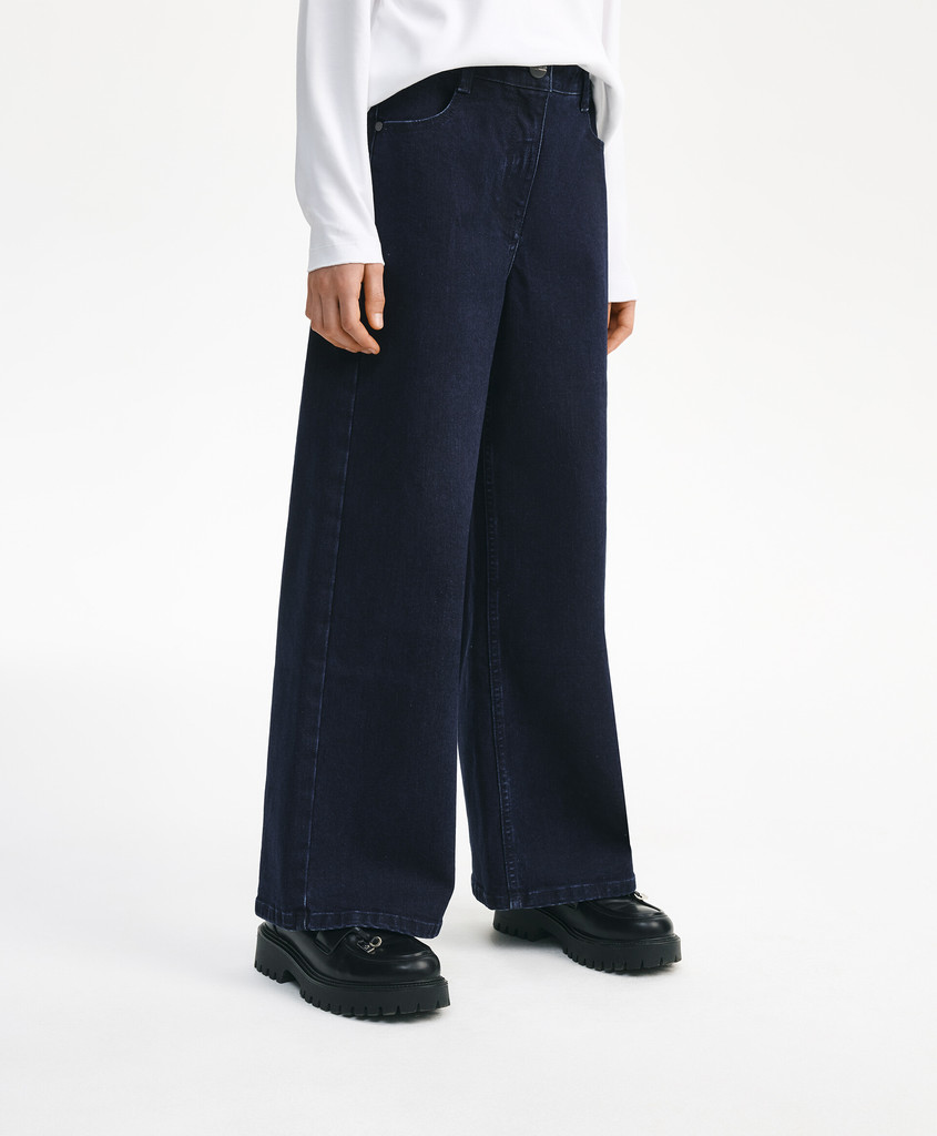 Синие джинсы силуэта палаццо – универсальная модель, которая легко впишется и в школьный, и в повседневный гардероб девочки. Джинсы выполнены из прочного и плотного хлопкового денима с эластаном. Спец... Показать описаниеиальная варка создала смягчающий эффект, наделив изделие легкой, еле заметной потертостью на швах, не препятствующей созданию образов в соответствии с школьным дресс-кодом. Они прекрасно сочетаются с деловым пиджаком и кардиганом, с блузкой и жилетом, с водолазкой и лонгсливом. Пять стандартных карманов делают джинсы для школы практичными и функциональными. Модная форма способствует их популярности среди девочек подросткового возраста.