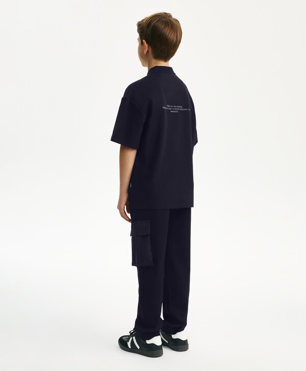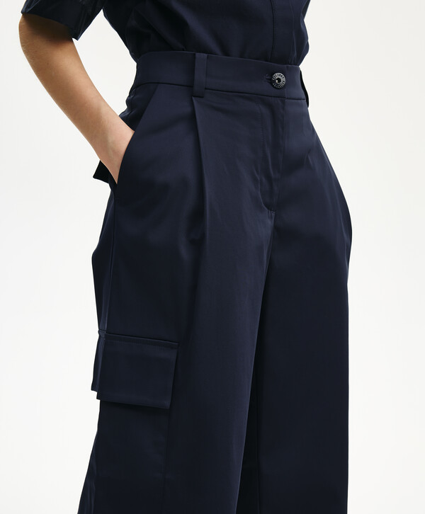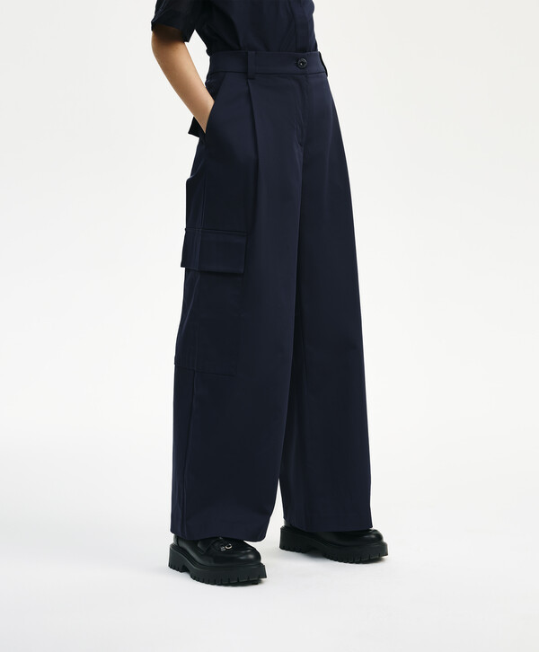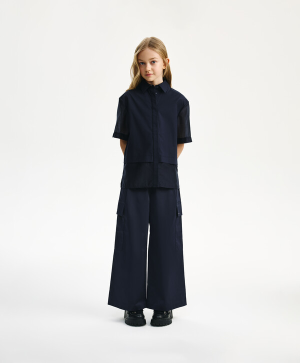 Синие широкие брюки с карманами карго - модный, удобный и функциональный выбор для школьного и повседневного гардероба девочки. Брюки выполнены из трехкомпонентного текстиля на основе хлопка, на части... Показать описаниечной шелковистой подкладке. Прямая свободная форма - трубы, созданная благодаря, в том числе, защипам в верхней части, а также крупные карманы-карго с клапанами и ложные клапаны на задних половинках брюк придают им остроту, динамику, непринужденность стритстайла, популярного тренда в среде стильных подростков. Брюки очень комфортны и практичны. Задняя часть пояса сделана на резинке, способствующей удобной эксплуатации изделия. Брюки застегиваются на молнию и пуговицу. Широкие школьные брюки-трубы прекрасно сочетаются с трикотажным пиджаком силуэта оверсайз, водолазкой, блузкой, рубашкой и т.п., создавая острые, стильные и интересные для ребенка комплекты на каждый день. верх 52% хлопок,45% полиэстер,3% эластан; подкладка 53% вискоза,47% полиэстер