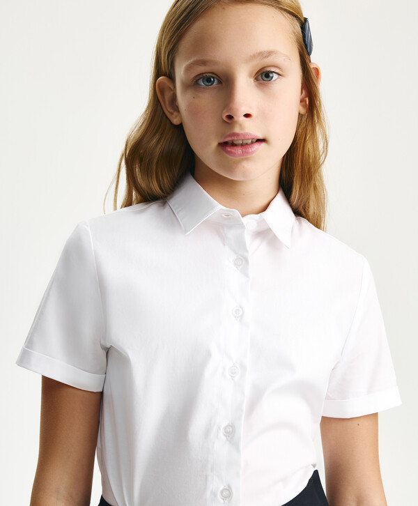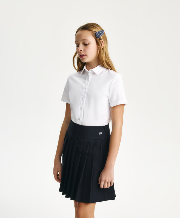 Белая блузка с коротким рукавом – прекрасная базовая вещь для школьных образов девочки. Блузка выполнена из легкого хлопкового текстиля с эластаном, очень комфортного в эксплуатации и уходе. Минимали... Показать описаниестичный дизайн, прямой крой и застежка на пуговицы придают модели строгий лаконичный вид, делают ее универсальным вариантом для школьного гардероба и не только. 97% хлопок,3% эластан