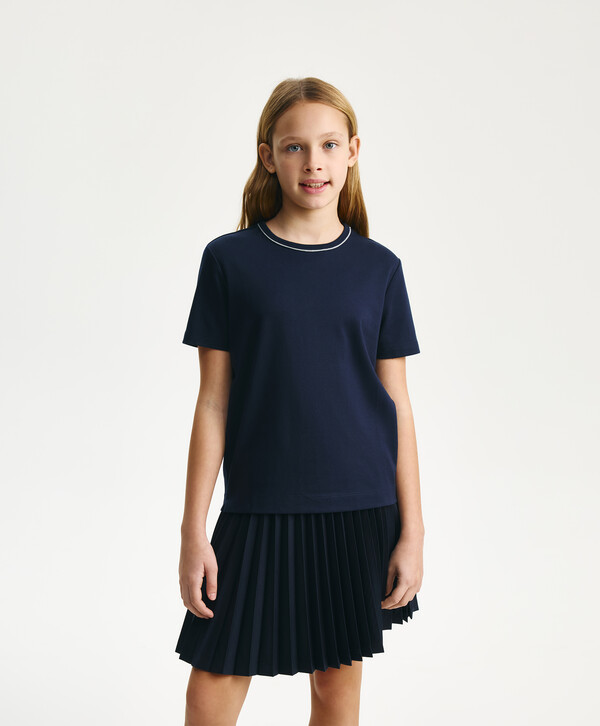 Синяя трикотажная блузка с длинным рукавом — изящный акцент школьного гардероба девочки. Блузка прямой формы выполнена из мягкого хлопкового трикотажного полотна, дарящего ощущение легкости, свежести,... Показать описание комфорта в течение дня. Контрастный белый воротник придаёт образу утонченность и элегантность. Текстильный воротник пристегивается к блузке на кнопки, что позволяет носить ее и с воротником, и без, и всегда выглядеть свежо и аккуратно. Блузка имеет застежку-капельку на спинке, фиксирующуюся на пуговицу с навесной петлей. В оформлении модели использована небольшая металлическая брендированная табличка. Школьная блузка гармонично сочетается и с классическими юбками и брюками, и с модными трубами, и с палаццо, легко вписываясь как в строгие, так и в непринужденные образы. основная ткань 95% хлопок,5% эластан; отделочная ткань 100% хлопок
