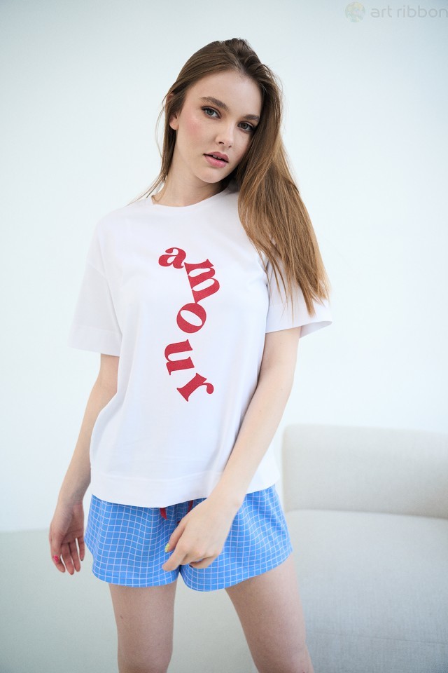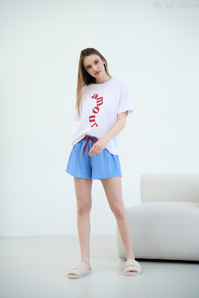 Эволюшен. Возможные размеры: 42-44-46-48. Очаровательный комплект для дома, созданный специально для женщин, обладает уникальным сочетанием нежности и уюта. Он словно воплощение мечты о комфорте и сти... Показать описаниеле одновременно. Благодаря использованию хлопка в изготовлении этой особой одежды, она приобретает особое очарование и легкость. Пижама – это не просто комплект из футболки и шорт, это целый символ уюта и домашнего тепла.Невероятно нежные материалы порадуют вашу кожу своей мягкостью, словно ласковое прикосновение летнего бриза. Шорты и футболка, великолепно дополняя друг друга, создают гармоничный образ для отдыха в уютном уголке вашего дома. Этот комплект призван подчеркнуть вашу естественную красоту без лишних усилий.Дизайн пижамы с шортами делает его незаменимым атрибутом повседневной роскоши. Будь то чашка горячего чая на балконе или уютный вечер за просмотром любимого сериала – эта одежда позволит вам по-настоящему расслабиться и насладиться моментом. Она словно создана для того, чтобы вы чувствовали себя комфортно и уверенно каждую минуту вашего отдыха.Этот комплект – верный выбор для тех, кто ценит не только стиль и качество, но также заботится о максимальном комфорте своего отдыха дома. Не отказывайте себе в возможности окунуться в атмосферу уюта и расслабленности с этим очаровательным комплектом домашней одежды! Состав ткани:Вискоза: 72%, Спандекс: 28%. Подробное описание: https://artribbon.ru/g1012-komplekt-domashnij-zhenskij.html