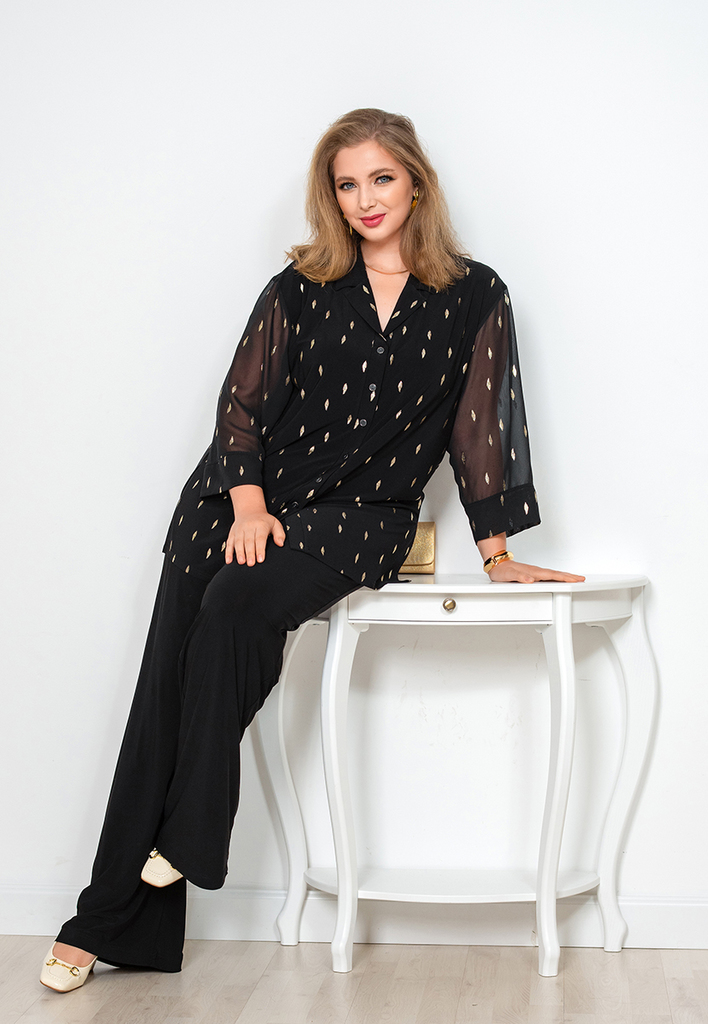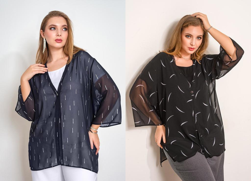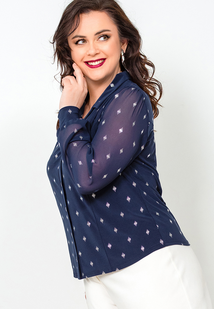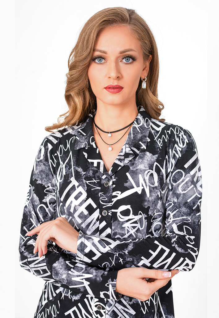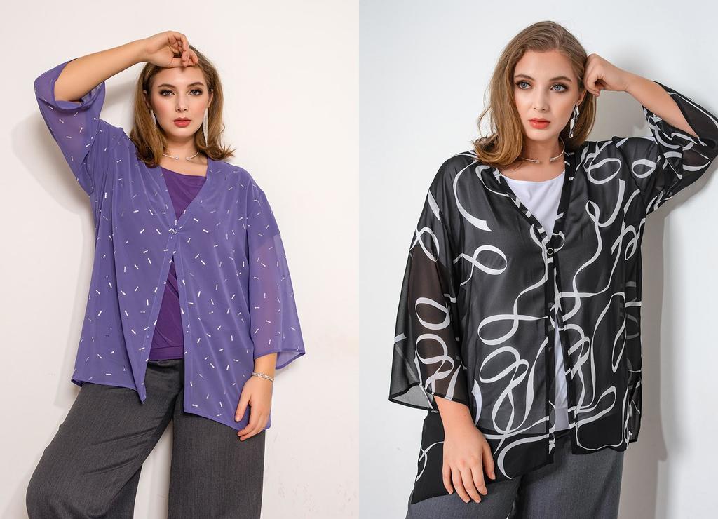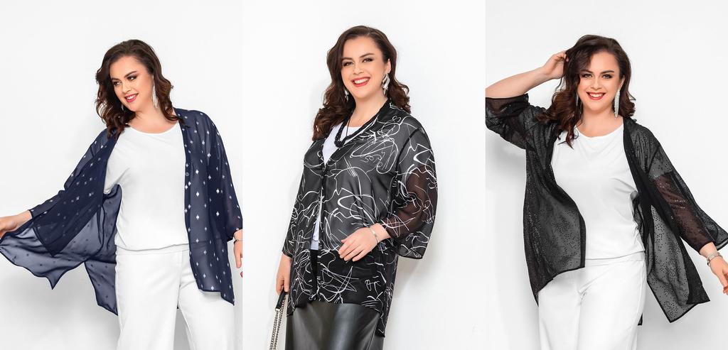 Состав: 35% вискоза, 60% ПЭ, 5% лайкра. Блузка свободного силуэта с разрезами по бокам. Рукав рубашечный (линия плеча приспущена), широкий, длиной 3/4, внизу на манжете. V-образный вырез оформлен англ ... Показать описаниеийским воротником. Застёгивается на пуговицы. Блузка и воротник выполнены из приятного к телу трикотажного полотна, рукава из нежного шифона с тем же рисунком, что и у основной ткани. Длина изделия 76 см для всех размеров. Подробное описание: https://kontaly.ru/catalog/bluzki/bluzka-s-shifonom-zhaklin-2021-bm3/