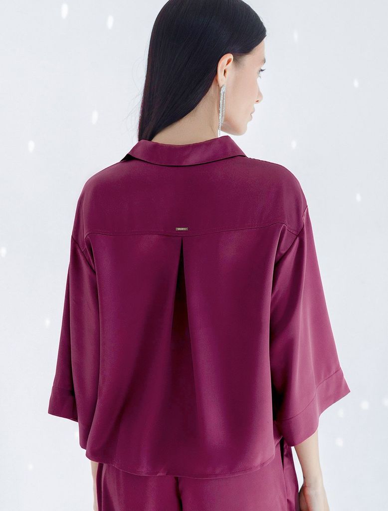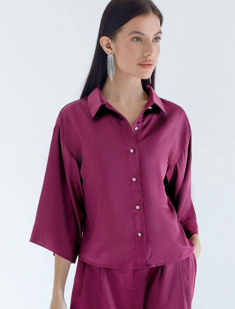 Состав: 97%ПЭ 3%ПУ Плотность: 190 Г/м2 Элегантная блузка цвета бургунди на пуговицах выполнена из плотного струящегося сатина, который мягко ложится по фигуре и создает эффектную посадку. Отложной вор... Показать описаниеотник придает образу женственную и изящную нотку. Материал отличается дышащей структурой, благодаря чему комфорт сохраняется даже в течение всего дня. Широкие рукава обеспечивают свободу движений и подходят для полных рук, делая блузку универсальной для разных типов фигур, в том числе для больших размеров. Красивая гладкая фактура материала подчеркивает утонченность изделия, добавляя легкое сияние к любому образу. Благодаря продуманному крою эта рубашка смотрится стильно как в повседневной жизни, так и на особых мероприятиях. Ткань практична, она приятна на ощупь, легко ухаживается и долго сохраняет первоначальный вид даже после многократных стирок и активной носки. Блузка с короткими рукавами станет отличным выбором для создания элегантного и практичного образа, блузка удобна для повседневного ношения в любое время года. Для женщин, которые ценят практичность и стиль, эта стильная блузка станет незаменимой в гардеробе. Она органично впишется в деловой дресс-код и подчеркнет индивидуальность на торжестве.