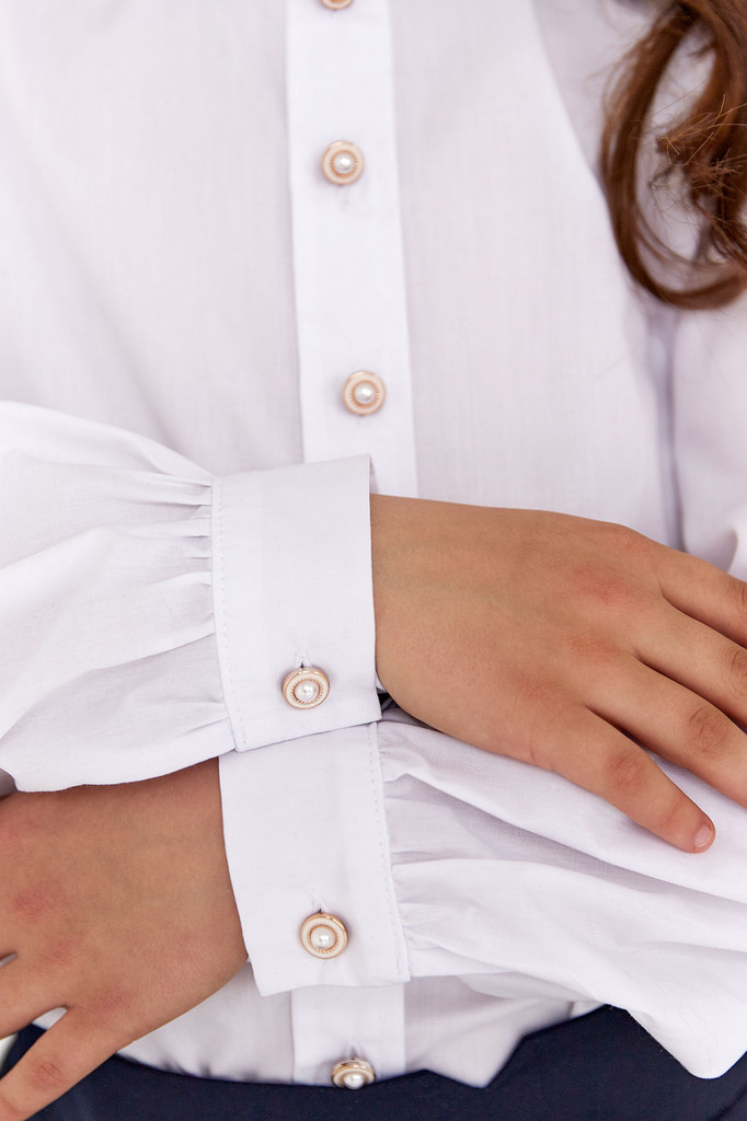Описание Нарядная блузка для девочки из хлопковой ткани. Блузка с центральной сквозной застежкой на петли и пуговицы. Воротник сорочечный на отрезной стойки. Блузка с рукавами - крылышками, собранными... Показать описание сборкой. По переду и по спинке имеются рельефные швы, идущие от плечевых швов до низа изделия. Блузка дополнена объёмными рюшами, расположенными в рельефных швах. Они придают нарядность и выступают в роли декоративного элемента. Эта модель блузки станет отличным решением для жарких школьных дней, а так же элегантно подчеркнет фигуру обладательницы. Параметры Рост: 122, 128, 134, 140, 146, 152 Состав и уход Состав: Хлопок/cotton 100%. Уход: * Стирка при температуре воды до 30°C * Не отбеливать * Гладить при температуре утюга до 110°C * Вертикальная сушка * Барабанная сушка запрещена * Профессиональная сухая чистка в тетрахлорэтилене и во всех растворителях, внесенных в список для символа F.