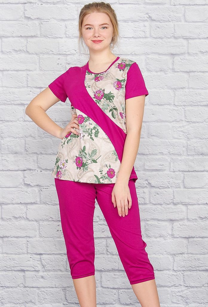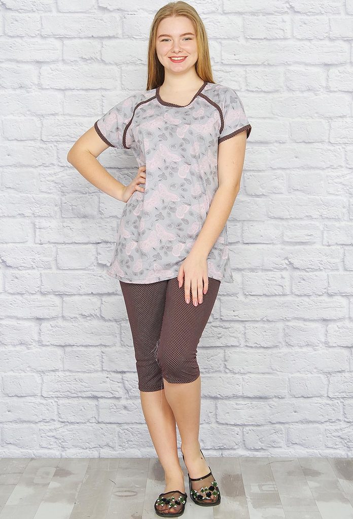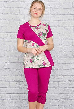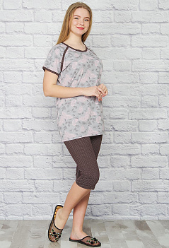 Состав: хлопок 100% Описание: Удобный домашний костюмчик. Футболка прямого кроя, горловина, плечевой шов и рукава окантованы. Бриджи облегающие, пояс на резинке. Ткань набивная кулирка.