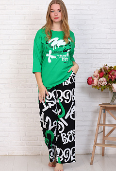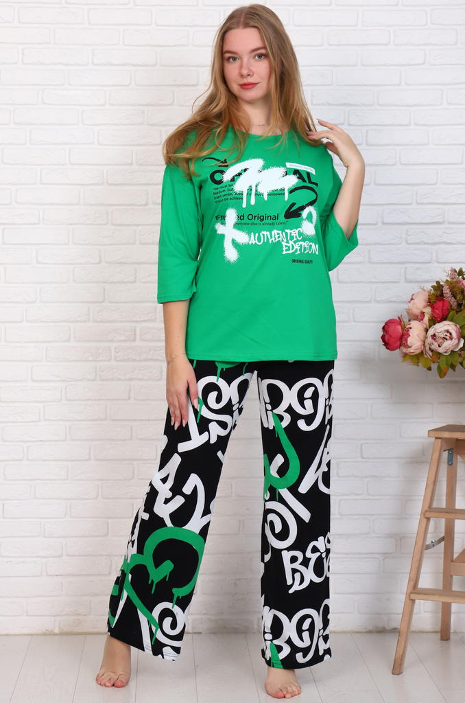 Состав: хлопок 100% Описание: Удобный и стильный хлопковый костюм, который должен быть в домашнем гардеробе каждой девушки! Популярный принт "Авокадо" прочно "вошёл в нашу жизнь". Футболка свободная, ... Показать описаниепрямого кроя, рукав со спущенным плечом и зауженные удлинённые бриджи с боковыми карманами, пояс на резинке. Ткань мягкая и приятная к телу кулирка.