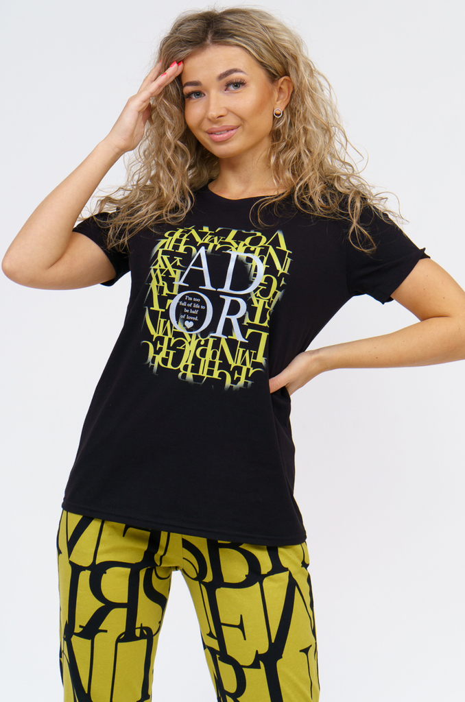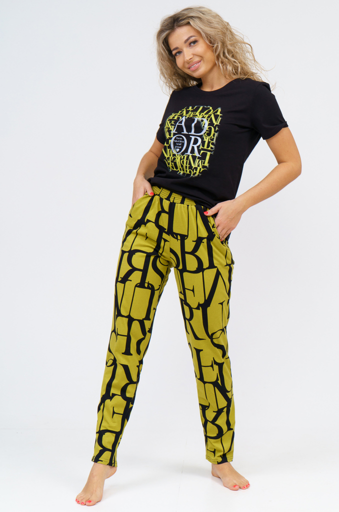 Состав: хлопок 100% Описание: Удобный симпатичный костюм для дома. Футболка прямого фасона, на полочке печатный принт. Свободные слегка зауженные брюки с боковыми карманами, пояс на широкой резинке. Т... Показать описаниекань - кулирка.