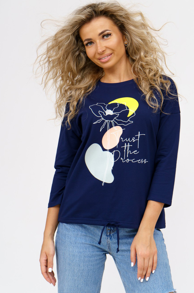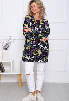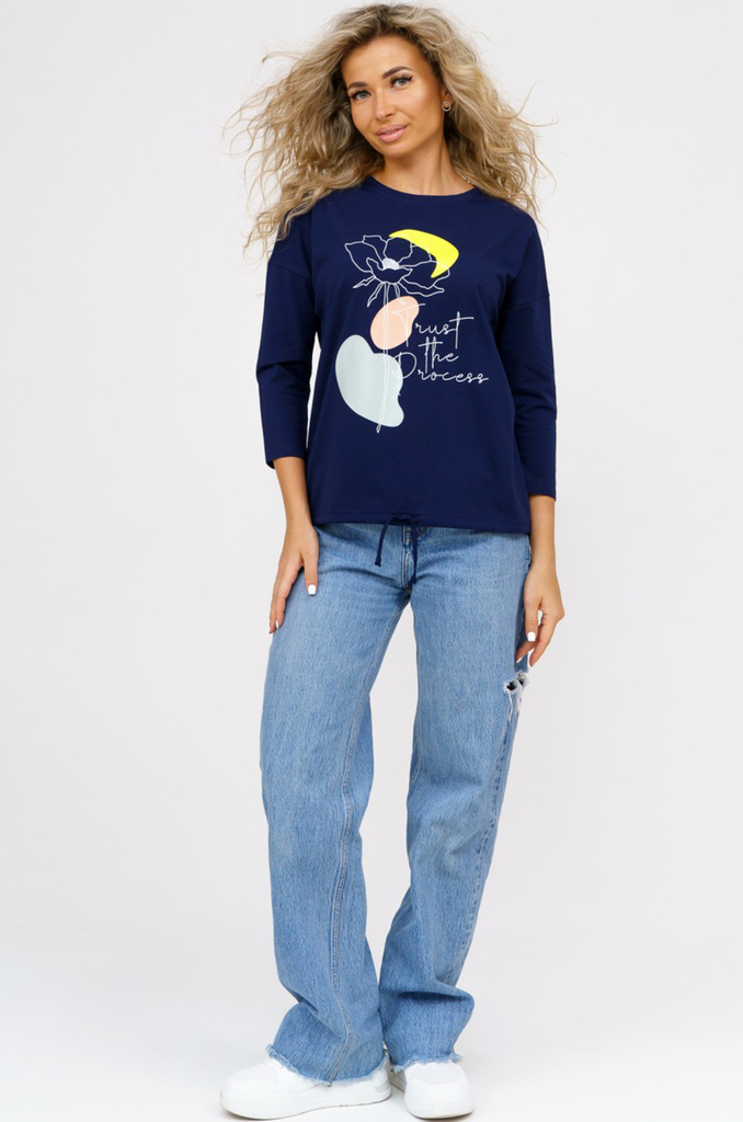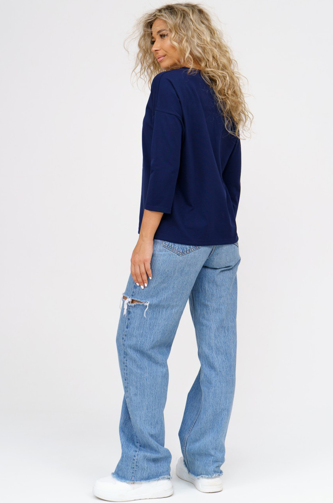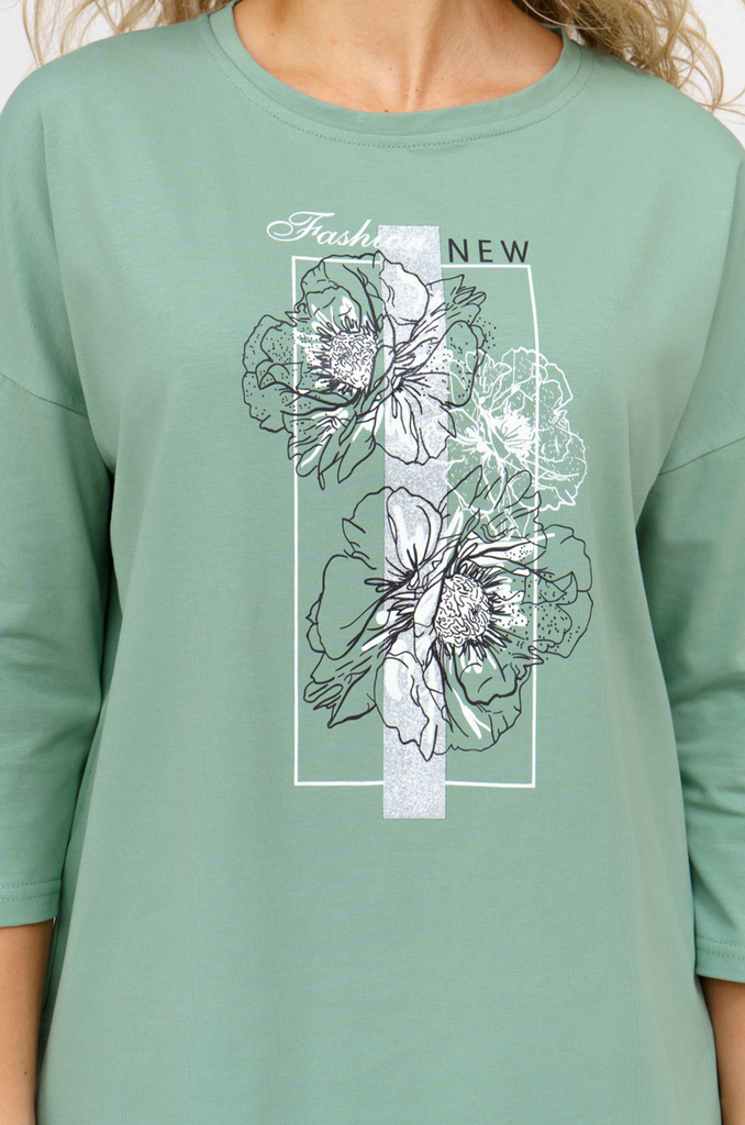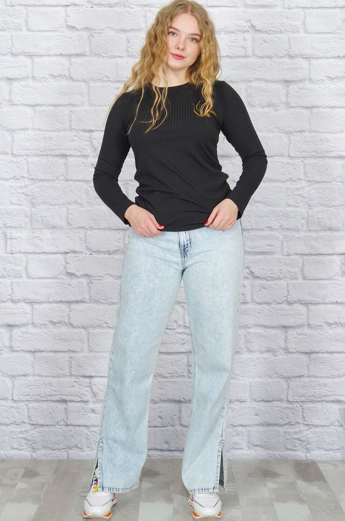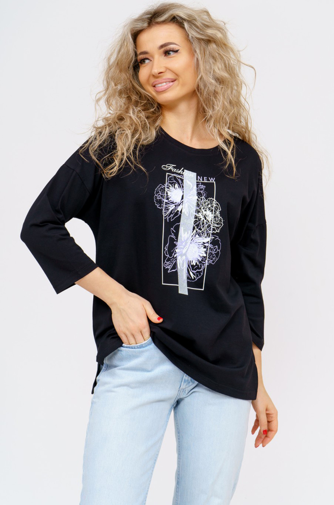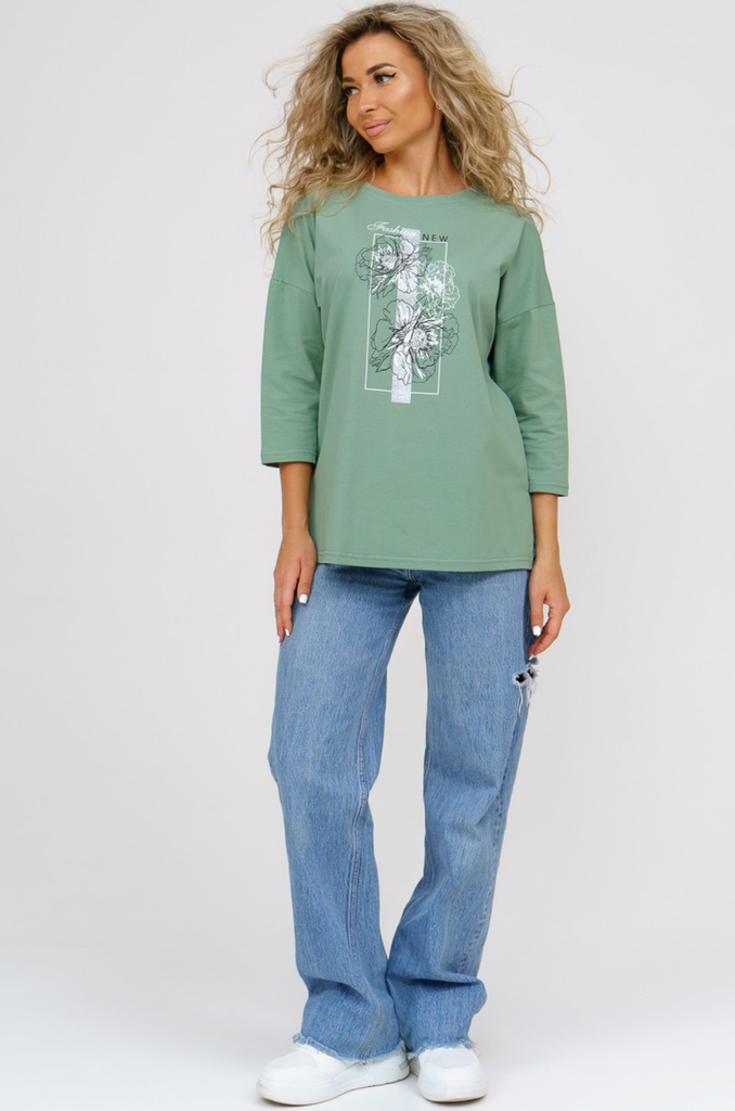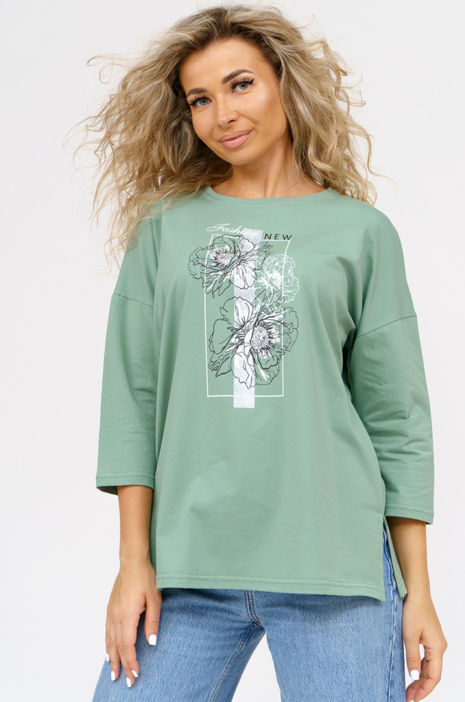Состав: хлопок 100% Описание: Женский лонгслив с рукавом 3/4 прекрасный вариант на прохладное время года. Модель прямого кроя со спущенным плечом. Спинка удлиненная, по бокам разрезы. Ткань кулирка.