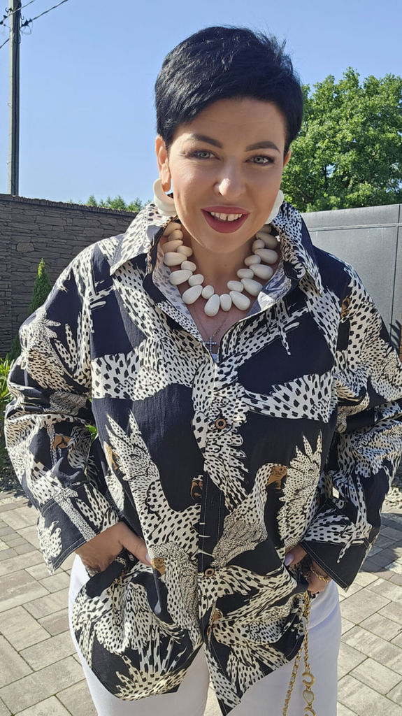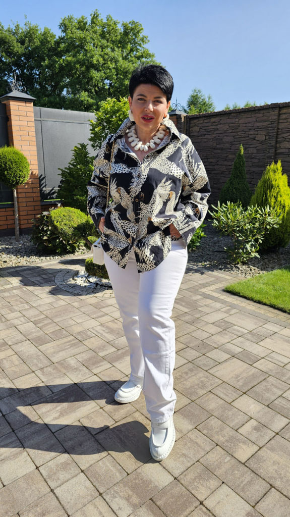 Состав: Хлопок-100%; Безумно красивая и стильная блузка с акцентом в виде яркого принта - идеальный вариант для тех, кто любит привлекать внимание. Блузка «оверсайз» с центральной застёжкой на петли-п... Показать описаниеуговицы по планке, воротником рубашечного типа. Спинка с притачной кокеткой. Линия плеча в блузке спущенная, рукав втачной с притачной манжетой по низу. Низ в блузке фигурной формы. В качестве декоративного отделочного элемента в блузке – отделочные строчки контрастного цвета. Обращаем Ваше внимание, что фурнитура может незначительно отличаться от фото. Длина блузки от высшей точки плечевого шва до низа — 75,5 см (р.52-56), 76,5 см (р.58-62). Длина рукава от горловины с плечом и манжетом 75,5 см (р.52-56), 76,5 см (р.58-62). блузка 52 54 56 58 60 62 обхват груди 131 135 139 143 147 151 обхват талии ширина изделия на уровне линии бедер 140 144 148 152 156 160 ширина рукава вверху 45 47 49 51 53 55
