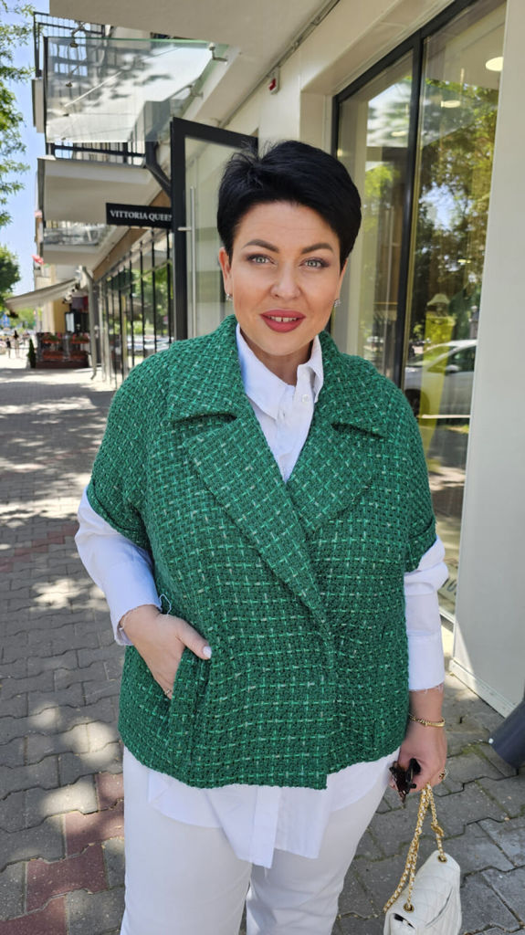 Состав: ПЭ-50%; Хлопок-30%; Акрил-20%; Модель отшивается под заказ. Срок пошива от 3 недель. Стильный, яркий жилет, который не оставит незамеченным никого, и станет отличным дополнением к Вашему осенн... Показать описаниеему гардеробу. Данный жилет станет отличным вариантом для повседневных образов, а также для работы в офисе. Жилет «оверсайз», свободного силуэта с двубортной застёжкой на потайные декоративные кнопки, воротником пиджачного типа. По переду жилета отделочные рельефы, нагрудные вытачки и прорезные карманы с листочкой. Спинка в жилете с подрезом и вытачками от низа. Рукав в жилете реглан с отложной манжетой по низу. Низ в жилете ассиметричный. Жилет на подкладке. Длина жилета вдоль середины спинки от шва втачивания воротника 63,5 см (р.52-56), 64,5 (р.58-62). Длина рукава жилета 38 см (р.52-56), 39 см (р.58-62). жилет 52 54 56 58 60 62 обхват груди 118 122 126 130 134 138 обхват талии обхват бедер 122 126 130 134 138 142