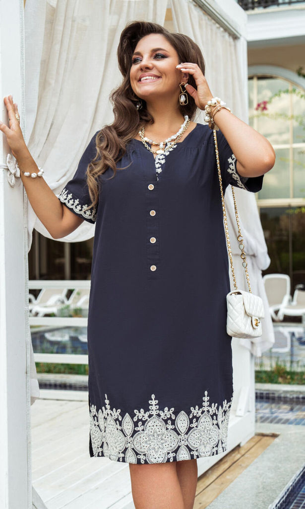 Состав: Хлопок-100%; Модель отшивается под заказ. Срок пошива от 3 недель. Маленькое аккуратное платье, так можно охарактеризовать данную модель. Удивительной красоты шитье молочного цвета на контраст... Показать описаниеном темно-синем фоне смотрится дорого и нарядно. Платье прямого силуэта с горловиной округлой формы с V-образным вырезом; планкой с имитацией застёжки на петли пуговицы, по переду платья кокетки со сборкой от подреза. Спинка платья с отрезной кокеткой с вышивкой ришелье. Рукав втачной с притачной манжетой из ришелье по низу. В боковых швах платья разрезы от низа. Платье на подкладке. Обращаем Ваше внимание, что фурнитура может незначительно отличаться от фото. Длина платья от высшей точки плечевого шва до низа 103 см (р.48-52), 106 см (р.54-58). Длина рукава 25,5 см. платье 48 50 52 54 56 58 обхват груди 109 113 117 121 125 129 обхват талии 111 115 119 125 129 133 обхват бедер 118 122 126 130 134 138 ширина рукава вверху 38 40 42 43 45 47