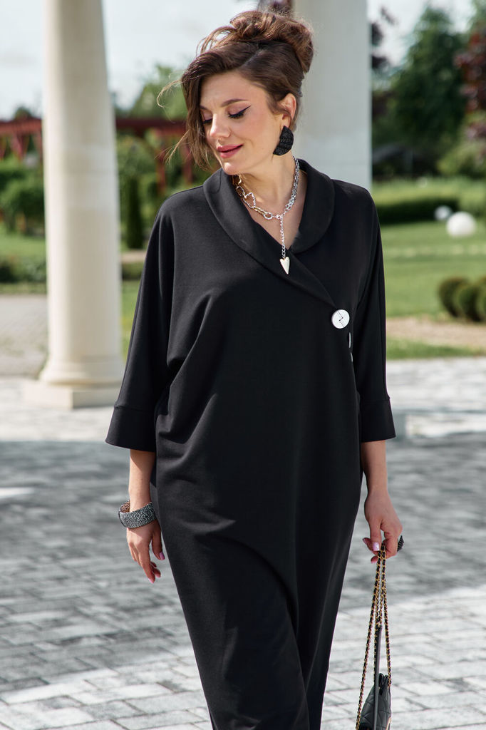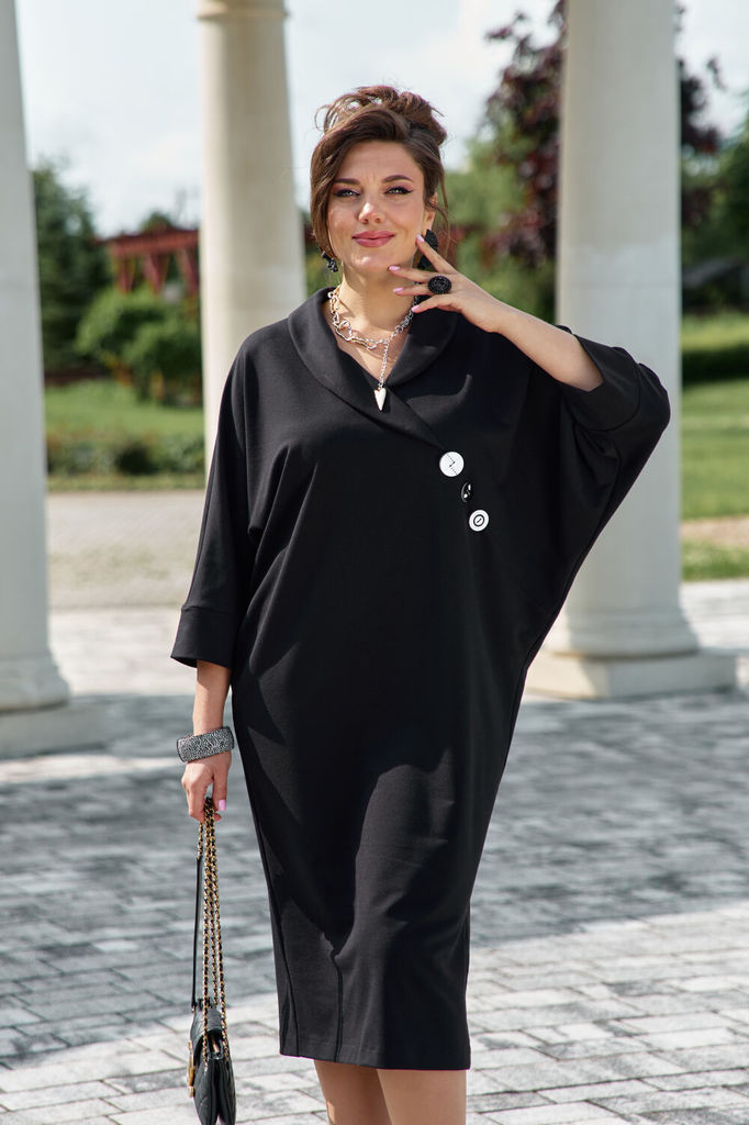 Состав: ПЭ-20%; Хлопок-75%; Эластан-5%; Модель отшивается под заказ. Срок пошива от 3 недель. Интересный крой платья и пластические свойства трикотажного полотна помогут скрыть недостатки фигуры и соз... Показать описаниедать идеальный образ. Платье свободного силуэта, заужается к низу. Горловина в платье открытая, с ассиметричным отложным воротником переходящим в подрез по переду платья. Спинка со средним швом. Рукав в платье по форме «летучая мышь» с притачной манжетой по низу.В качестве главного акцента платья, который приковывает взгляды, являются пришивные декоративные пуговицы контрастного цвета и разных размеров.Обращаем Ваше внимание, что фурнитура может незначительно отличаться от фото. Длина платья 112,5 см. Длина рукава 58 см (р.52-56), 60 (р.58-62). Платье 52 54 56 58 60 62 обхват груди 132 136 140 144 148 152 обхват бедер 122 126 130 134 138 142 ширина рукава внизу 34 34 34 38 38 38 длина по спинке 112,5 112,5 112,5 112,5 112,5 112,5