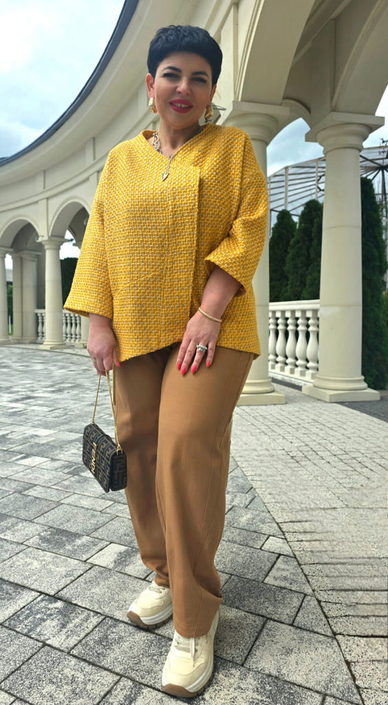 Состав: Блуза: Хлопок-100%; Брюки: ПЭ-26%; Хлопок-72%; Эластан-2%; Безумно красивый и стильный комплект с акцентом в виде яркого принта блузки- идеальный вариант для тех, кто любит привлекать внимание... Показать описание. Практичный и элегантный комплект поможет создать образ, который будет отлично смотреться на любом типе фигуры. Блузка «оверсайз» с центральной застёжкой на петли-пуговицы по планке, воротником рубашечного типа. Спинка с притачной кокеткой. Линия плеча в блузке спущенная, рукав втачной с притачной манжетой по низу. Низ в блузке фигурной формы. В качестве декоративного отделочного элемента в блузке – отделочные строчки контрастного цвета. Брюки прямого силуэта с застёжкой на тесьму-молнию в гульфике и пуговицу в поясе. Пояс в брюках притачной с эластичной тесьмой резинкой в боках. В боках по переду брюк наклонные карманы. В задних половинках брюк вставка кокетки с отстрочкой и накладные карманы. В качестве отделочного декоративного элемента брюк- отделочные строчки контрастного цвета. Обращаем Ваше внимание, что фурнитура может незначительно отличаться от фото. Длина брюк по боковому шву от шва притачивания пояса см.Длина блузки от высшей точки плечевого шва до низа — 75,5 см (р.52-56), 76,5 см (р.58-62). Длина рукава от горловины с плечом и манжетом 75,5 см (р.52-56), 76,5 см (р.58-62). Длина брюк по боковому шву от шва притачивания пояса 98 см. блузка 52 54 56 58 60 62 обхват груди 131 135 139 143 147 151 обхват талии ширина изделия на уровне линии бедер 140 144 148 152 156 160 ширина рукава вверху 45 47 49 51 53 55 брюки 52 54 56 58 60 62 ширина на уровне среднего шва 114 118 122 126 130 134 ширина по линии талии с резинкой 84 88 92 96 100 104 ширина по линии талии без резинки 98 102 106 110 114 118 ширина внизу 45 45 45 48 48 48