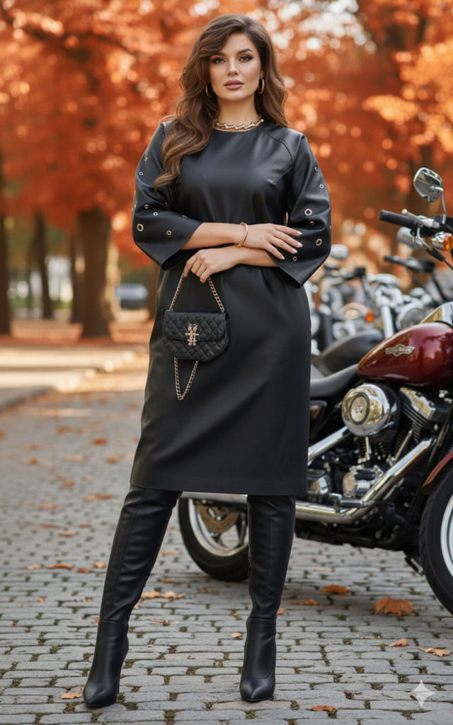 Состав: Платье: ПЭ-86%; ПУ-14%; Подкладка: ПЭ-100%; Модель отшивается под заказ. Срок пошива от 3 недель. Платье полуприлегающего силуэта с округлой формой горловины. По переду платья нагрудные вытачк... Показать описаниеи. По спинке застёжка на декоративную тесьму молнию в среднем шве платья и разрезом от низа. Рукава становятся главным акцентом: ряд люверсов и кнопок, выстроенных словно доспехи, придают образу дерзкий, почти урбанистический шик. Рукав в платье реглан, расширяется к низу, длиной 7/8. В боковых швах платье карманы. Длина платья 109 см (р 50-54), 111 см (р 56-60). Длина рукава 61 см. Платье 50 52 54 56 58 60 обхват груди 110 114 118 122 126 130 обхват бедер 120 124 128 132 136 140 длина спинки 109 109 109 111 111 111 ширина рукава вверху 42 44 46 46 48 50