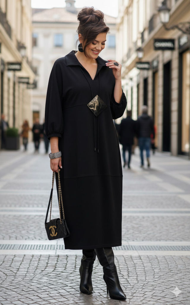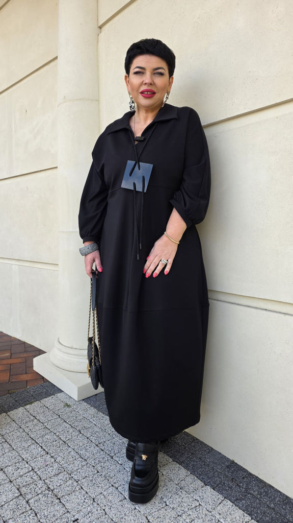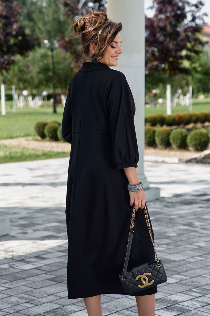 Состав: ПЭ-20%; Хлопок-75%; Эластан-5%; Модель отшивается под заказ. Срок пошива от 3 недель. Представляем вашему вниманию элегантное платье миди в насыщенном чёрном оттенке, который актуален в любом ... Показать описаниесезоне. Выполненное из мягкой, струящейся ткани, оно обеспечивает приятные ощущения при носке и безупречную посадку. Свободный крой платья напоминающий собой форму «купола» слегка заужается к низу придает силуэту изящество и позволяет ему деликатно ниспадать по фигуре. V-образный вырез горловины, дополненный отложным воротником, придает платью классический и в то же время современный вид. Линия талии завышенная, лиф платья двойной, со средним швом. Рукав в платье цельнокроеный со сборкой на манжету, добавляют образу непринужденности и объема. Горизонтальный шов, расположенный примерно на уровне бедер, создает интересный структурный акцент. В боковых швах карманы. В качестве дополнительного декоративного элемента в комплекте с платьем идёт украшение ручной работы. Длина платья 125 см., длина рукава 62,5 см (р 52-56), 64,5 см (р 58-62). Платье 52 54 56 58 60 62 обхват груди 112 116 120 124 128 132 обхват бедер 136 140 144 148 152 156 обхват талии 104 108 112 116 120 124 длина по спинке 125 125 125 125 125 125