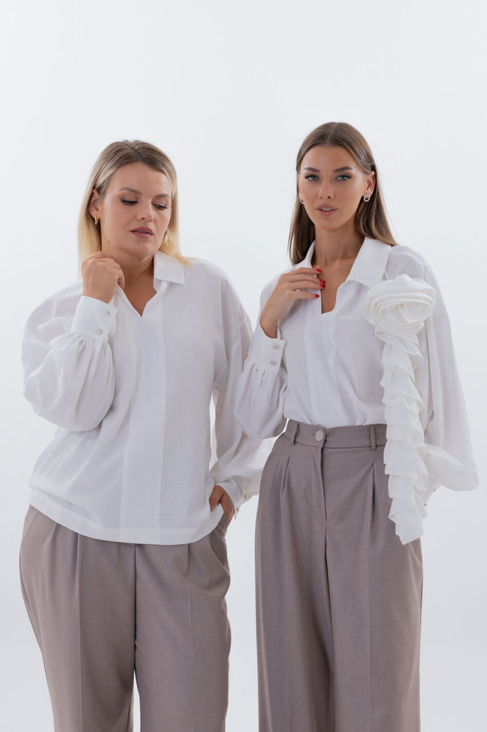 Состав: ПЭ-100%; Блуза свободного кроя со съемными цветами Kivvi Wear — Искусство Преображения Kivvi Wear представляет блузу, в которой классика встречается с игрой. Модель свободного прямого силуэта&... Показать описаниеnbsp; — это холст для вашего самовыражения. Её лаконичный крой с отложным воротником и глубоким вырезом создает идеальную базу, а широкие рукава со сборкой на манжетах добавляют образу пластичную легкость. Но главная магия — в деталях. Блуза комплектуется съемными декоративными цветами из основной ткани, которые можно расположить на груди или рукавах, каждый раз создавая новый уникальный силуэт. Носите их для романтичного акцента или снимите для строгой лаконичности — ваше настроение диктует правила. Эта блуза дарит комфорт в течение всего дня. Она станет ключевой вещью в гардеробе: сочетайте её с юбками-миди и брюками для офиса или с джинсами для прогулки. Это не просто блуза — это ваше личное поле для творчества. Рост 164-170 Правила стирки: только деликатная стирка 30 градусов, не использовать отбеливатели, изделие вывернуть наизнанку