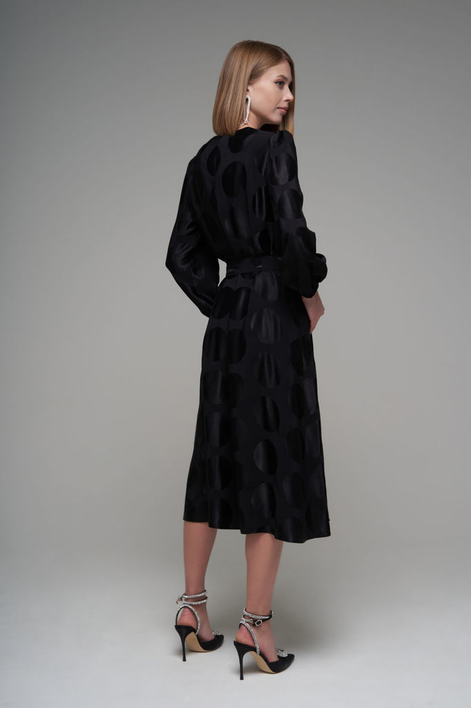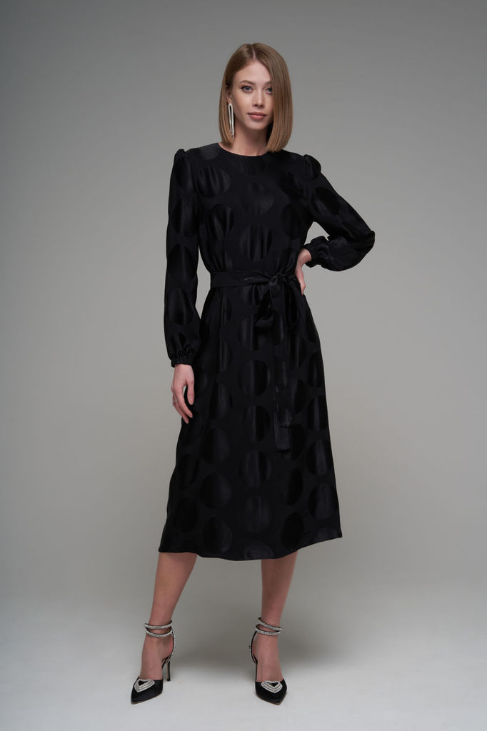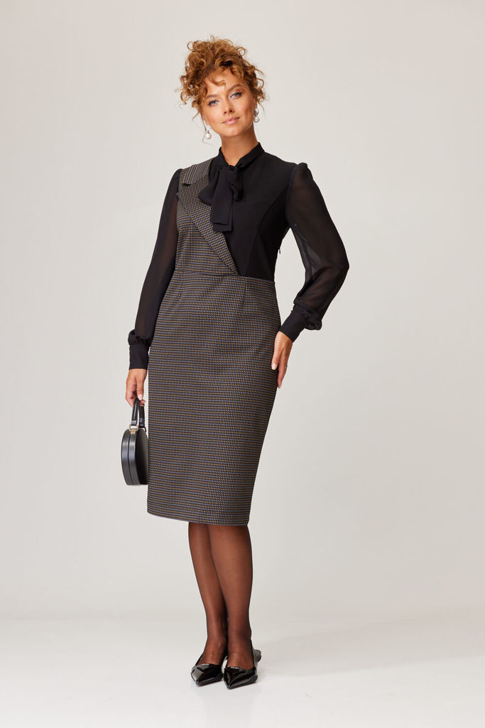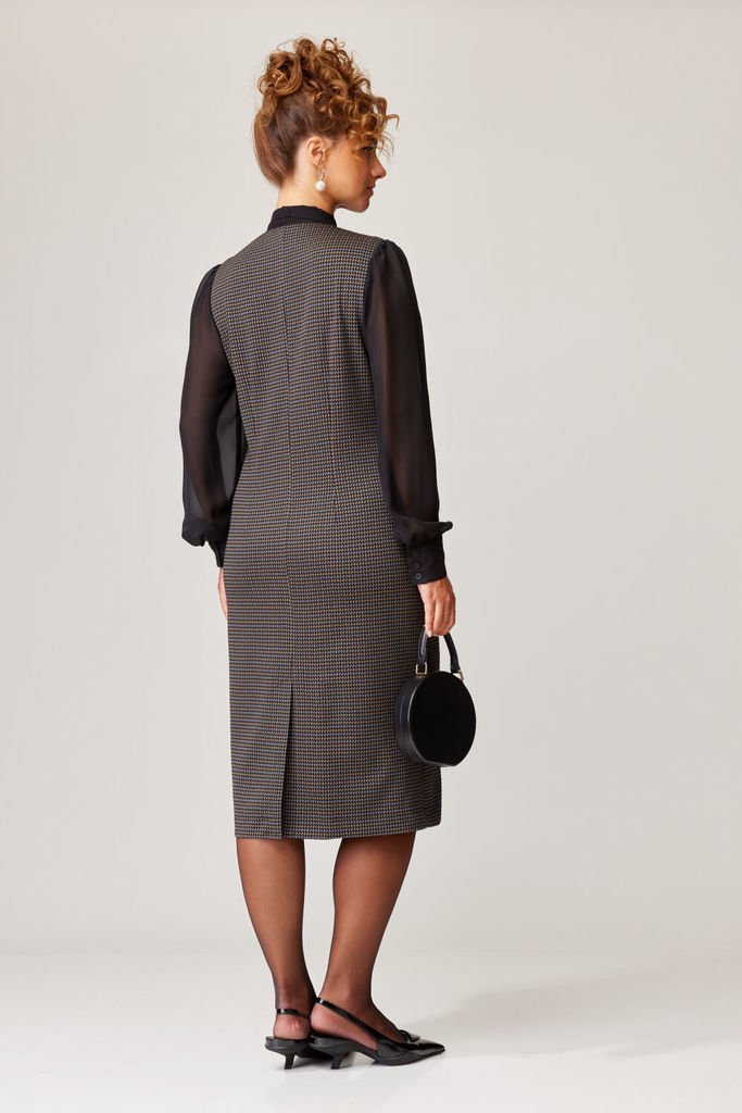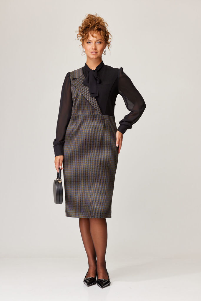 Состав: Вискоза-30%; ПЭ-66%; Эластан-4%; Сезон: Осень-Зима Рост: 164 Страна бренда: Беларусь Состав: Вискоза-30%; ПЭ-66%; Эластан-4%; Платье полуприлегающего силуэта из трикотажа средней плотности, от... Показать описаниерезное по линии талии. Правая часть переда имитирует жакет с воротником пиджачного типа. Левая часть переда имитирует блузку с воротником стойкой переходящем в бант. В правой и левой части рельефы. Нижняя часть переда с талиевыми вытачками. Спинка со средним швом и талиевыми вытачками. Внизу среднего шва шлица. Рукав втачной одношовный со сборкой по окату и по линии притачивания манжеты. Манжета застегивается на 3 петли и пуговицы. Рукава и бант выполнены из шифона. Длина платья - 107 см, длина рукава - 64 см.