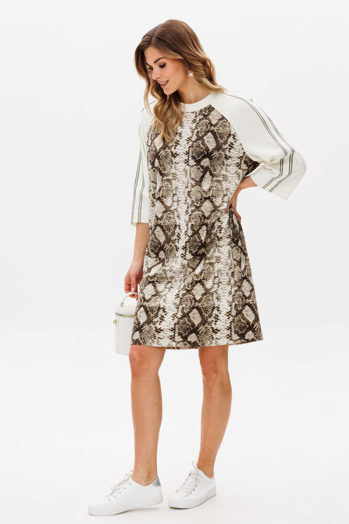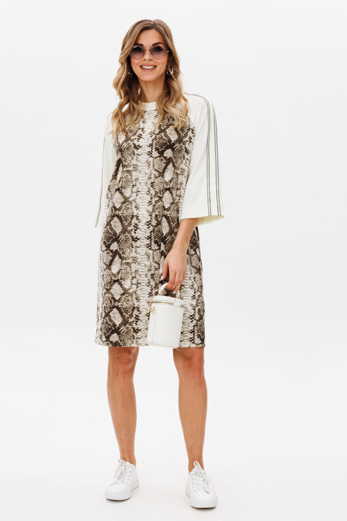 Состав: Вискоза-23%; ПЭ-74%; Спандекс-3%; Сезон: Весна Рост: 164 Страна бренда: Беларусь Состав: Вискоза-23%; ПЭ-74%; Спандекс-3%; Платье прямого силуэта из трикотажной ткани с принтом. Рукав реглан с... Показать описание декоративной лампасом. Горловина округлой формы обработна планкой. Длина платья - 96 см, длина рукава платья - 54см.