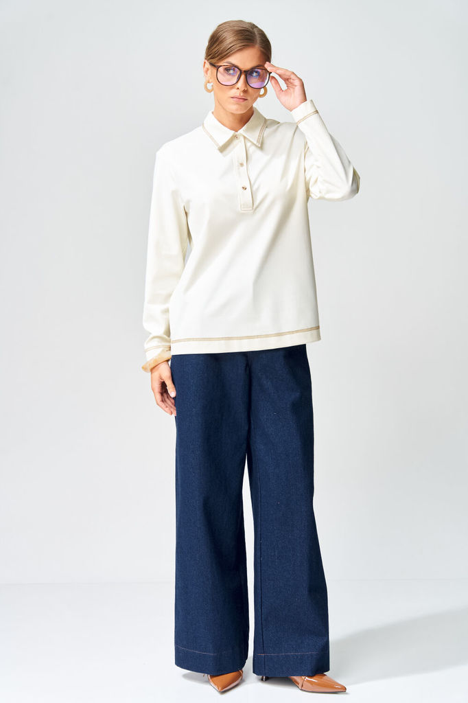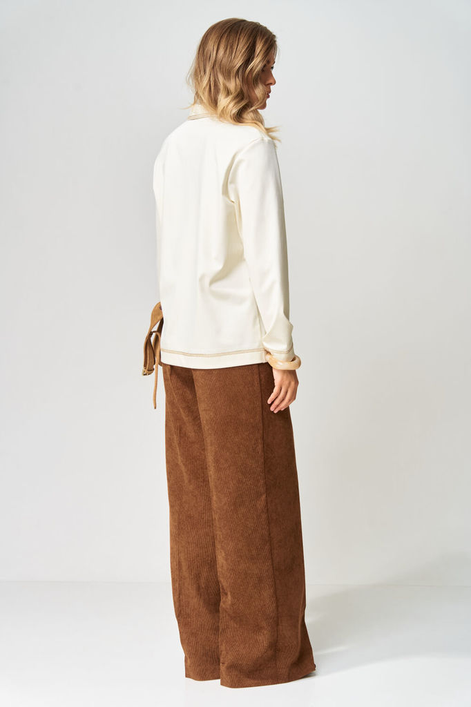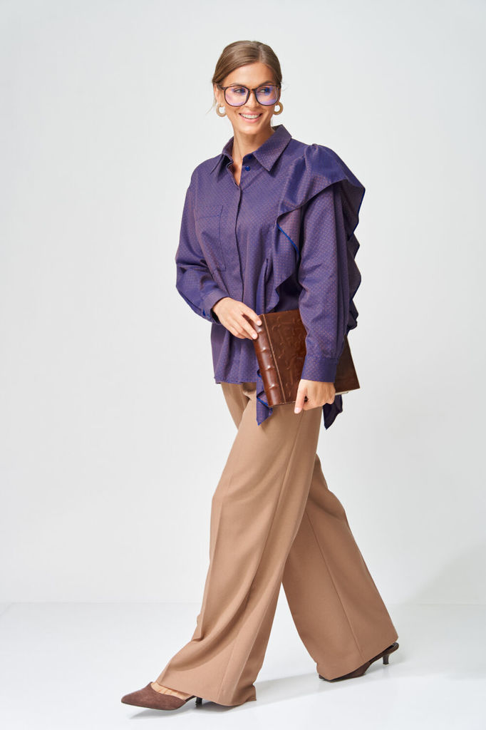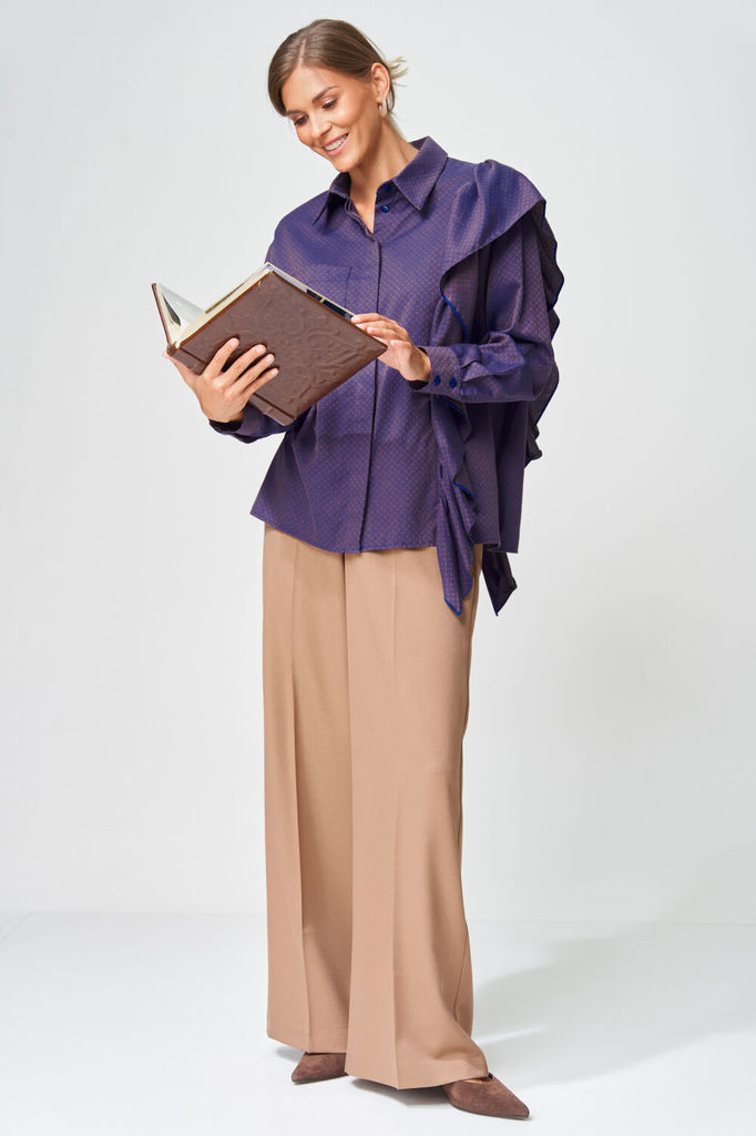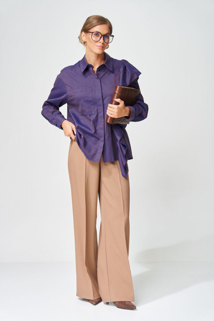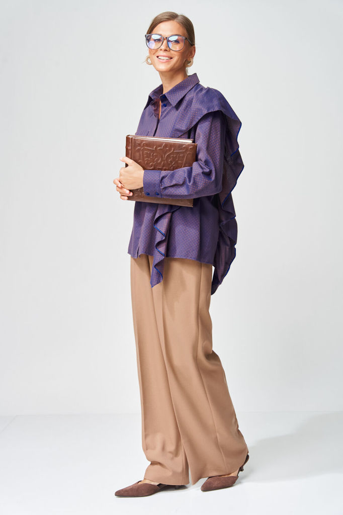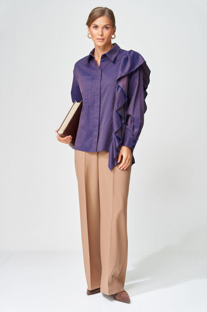 Состав: Блуза- Хлопок-100%; Брюки- ПЭ-100%; Сезон: Осень-Зима Рост: 170 Страна бренда: Беларусь Состав: Блуза: Хлопок-100%; Брюки: ПЭ-100%; Костюм состоит из блузки (рубашки) и брюк. Рубашка прямого с... Показать описаниеилуэта выполнена из хлопковой ткани с оригинальным жаккардовым переплетением. Перед с центральной застежкой потайной планкой. Левая часть переда и спинка с воланом на сборке вставленном в рельеф. На правой части переда настрочен карман. Рукав втачной одношовный с манжетой по низу, на манжете застежка на 2 петли и пуговицы. Воротник отложной со стойкой. Брюки расширеные книзу с притачным поясом выполнены из костюмной ткани. В поясе по бокам вставлена резинка. По передней и задней частям брюк вытачки и заутюжены стрелки. Спереди застежка гульфик на молнии и пуговицей на поясе. Фурнитура может быть изменена с сохранением художественного образа. Длина рубашки - 65 см, длина рукавав рубашки - 53 см. Длина брюк по боковому шву без учета пояса- 106 см.