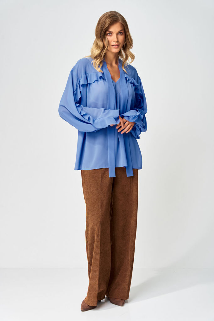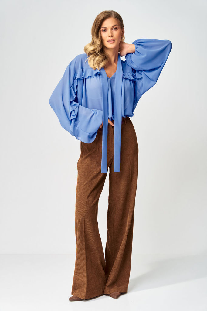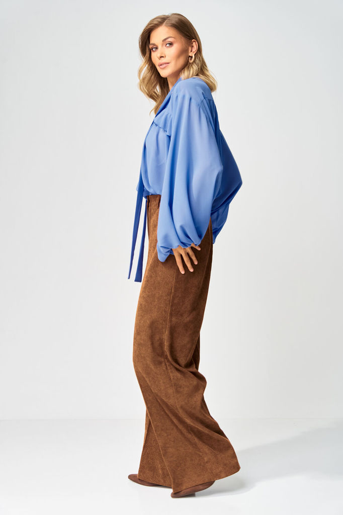 Состав: Блуза- ПЭ-100%; Брюки- ПЭ-100%; Сезон: Осень-Зима Рост: 170 Страна бренда: Беларусь Состав: Блуза: ПЭ-100%; Брюки: ПЭ-100%; Блузка свободного силуэта из струящейся шифоновой ткани. Перед и спи... Показать описаниенка с кокеткой и сборкой. Рукав спущенный свободный с резинкой понизу. Вдоль линии кокетки и рукава вставлена рюша. Горловина V-образной формы с воротником стойкой переходящей в бант. Брюки палаццо с притачным поясом из мягкой вельветовой ткани. Спереди застежка гульфик на молнии и петлей и пуговицей по поясу. По задней частям брюк вытачки. Пояс с резинкой в боковых частях. Брюки с заутюженными стрелками. Длина блузки - см, длина рукава - см. Длина брюк с учетом пояса - 109 см.