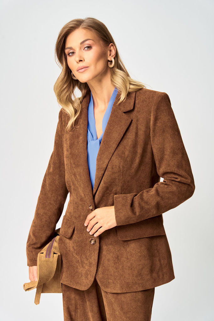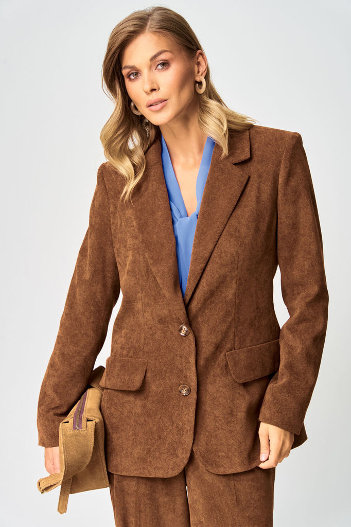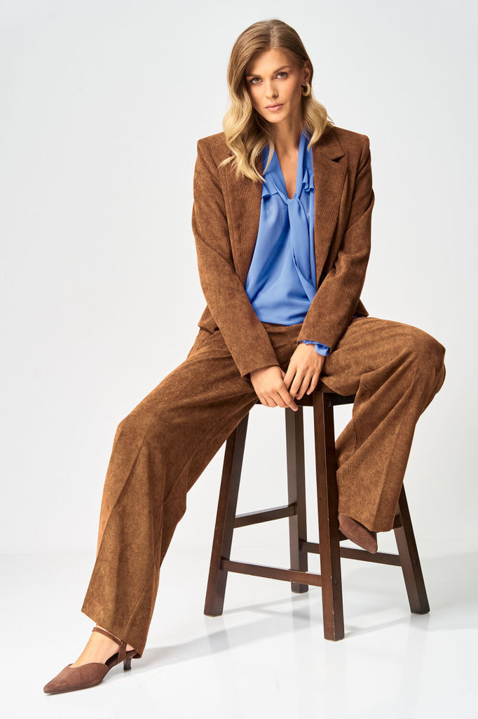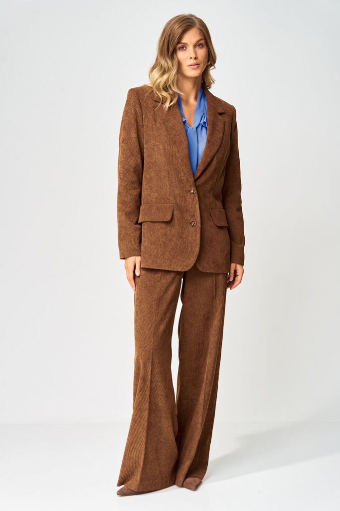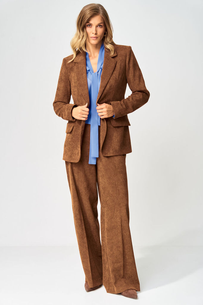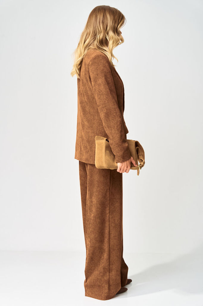 Состав: ПЭ-100%; Сезон: Осень-Зима Рост: 170 Страна бренда: Беларусь Состав: ПЭ-100%; Костюм состоит из жакета и брюк. Жакет полуприлегающего силуэта из мягкой вельветовыой ткани приятного кашт... Показать описаниеанового цвета. Застежка однобортная на две пуговицы, воротник пиджачного типа. Перед с талиевой вытачкой, рельефом и декоративным клапаном. Спинка с рельефами из проймы и средним швом. Рукав втачной двухшовный. Жакет на подкладке. Брюки палаццо с притачным поясом из мягкой вельветовой ткани. Спереди застежка гульфик на молнии и петлей и пуговицей по поясу. По задней частям брюк вытачки. Пояс с резинкой в боковых частях. Брюки с заутюженными стрелками. Длина жакета - 68 см, длина рукава жакета - 60 см. Длина брюк с учетом пояса - 109 см. Данная модель прекрасно сочетается с другой моделью из нашей коллекции 15410. Создайте гармоничный образ, комбинируя эти изделия!