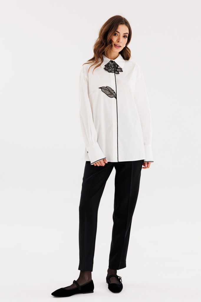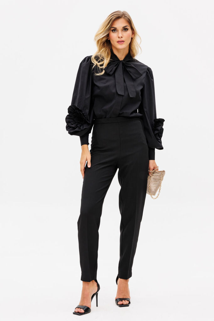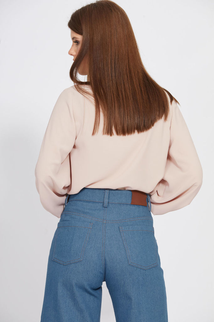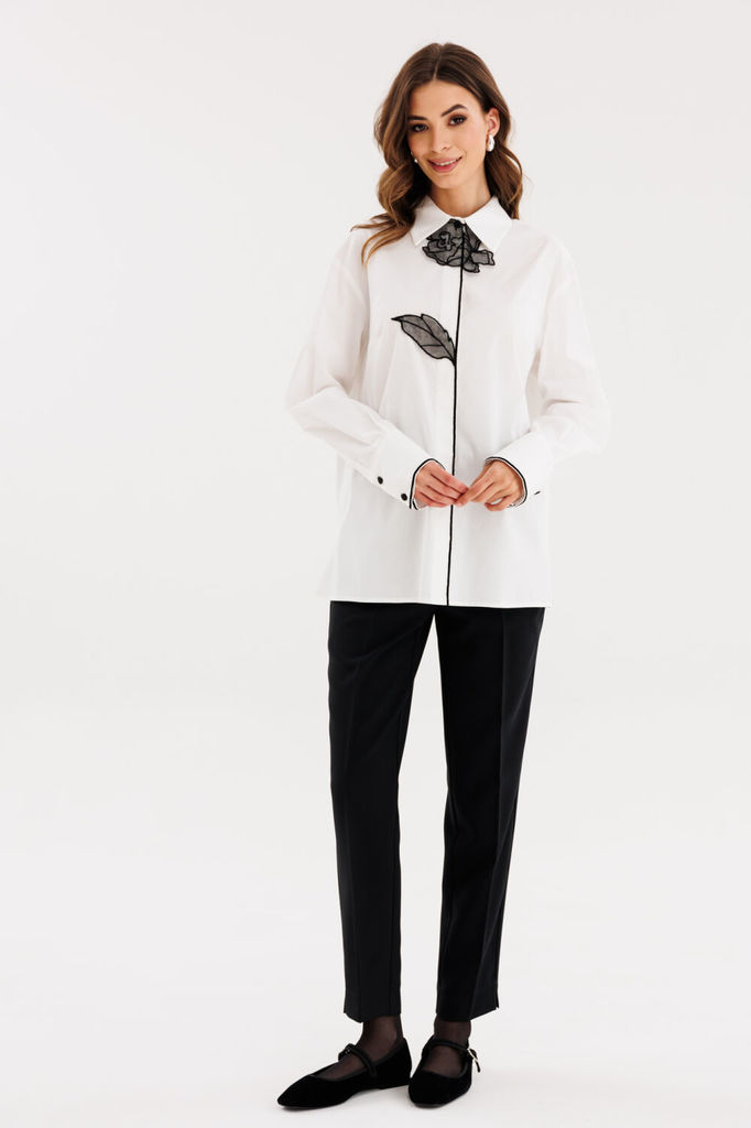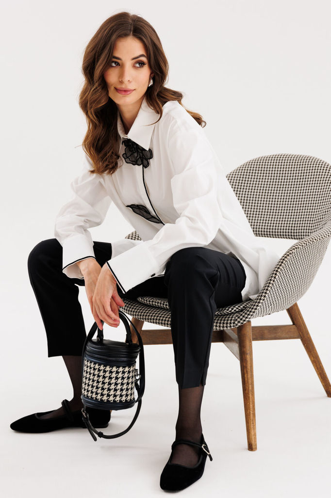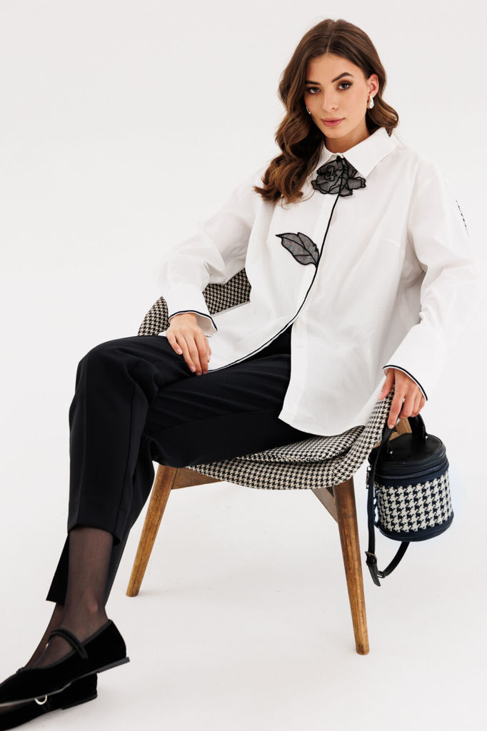 Состав: ПЭ-22%; Хлопок-76%; ПУ-2%; Блузка выполнена из плательно-блузочной ткани.Блузка прямого силуэта, длиной выше линии бедер. Спереди центральная застежка с потайной планкой. Спинка цельная. Ворот... Показать описаниеник стояче-отложной, переходящий в бант. Рукав втачной одношовный, со сборкой по окату, расширенный и присборенный по низу. Низ рукава на притачной манжете с застежкой на пуговицу. В боковых швах разрезы. Блузка декорирована по рукавам объемными настрочными цветами из основной ткани. Длина блузки: р. 44-48 - 66,5 см, р. 50-54 - 68 см.Длина рукава: р. 44-48 - 65 см, р. 50-54 - 66 см. Гарантийный срок не установлен ГОСТ 25294-2003 Размерный ряд 44 46 48 50 52 54 Длина по центру спинки 66,5 66,5 66,5 68 68 68 Длина рукава 65 65 65 66 66 66 Объем по груди 95 99 103 107 111 115 Объем по талии 98 102 106 110 114 118 Объем по низу 101 105 109 113 117 121 Объем рукава вверху 48 50 52 52 54 56 Объем рукава внизу 18 18 18 19,5 19,5 19,5