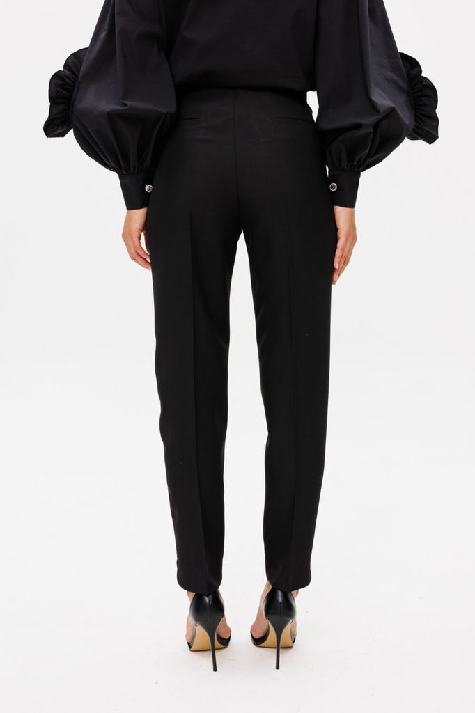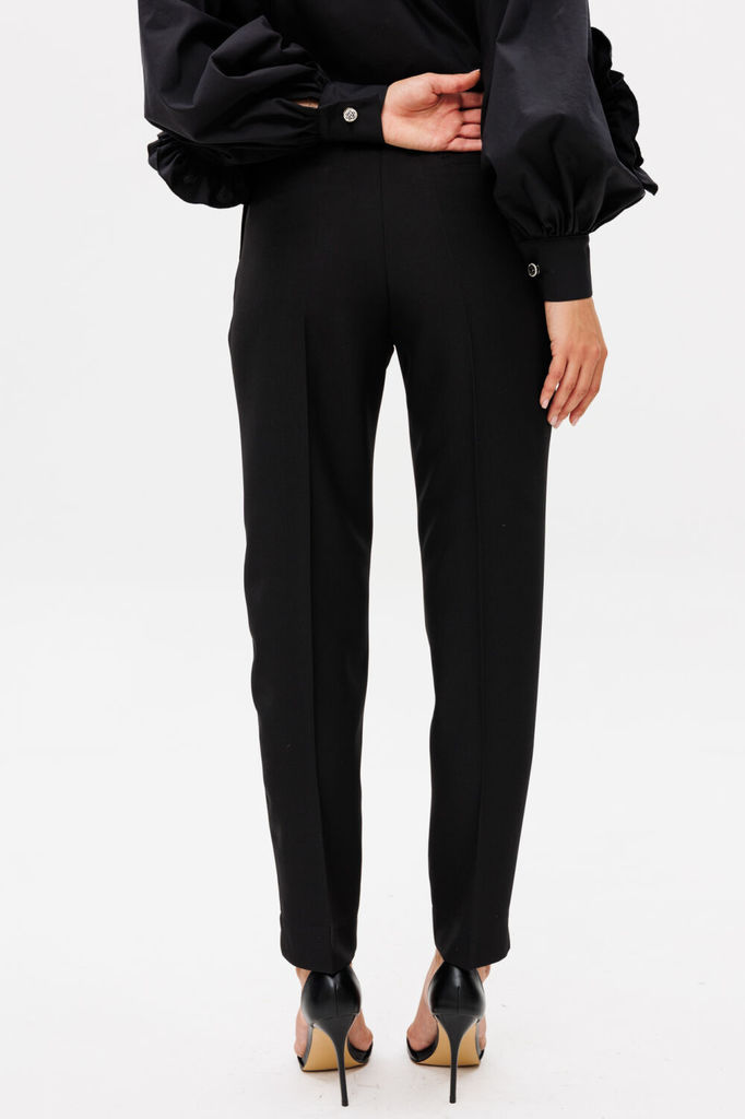 Состав: ПЭ-96%; ПУ-4%; Брюки выполнены из однотонной костюмной ткани, заужены к низу, на задних половинках карманы с листочкой, застежка в боковом шве на металлическую молнию и пуговицу. По низу в бок... Показать описаниеовом шве разрезы. Длина брюк р.44-54: с поясом - 100 см, без пояса - 98 см. Гарантийный срок не установлен. ГОСТ 25295-2003 Замеры 44-54: Длина по боковому шву 100 100 100 101,5 101,5 101,5 Объем по талии 72 76 80 84 88 92 Объем по бедрам 94 98 102 106 110 114 Объем по голени 38 40 42 44 46 48 Ширина пояса 3 3 3 3 3 3