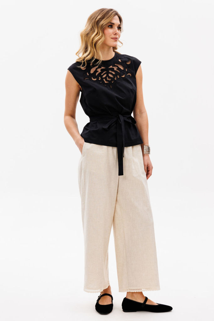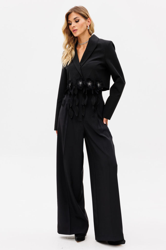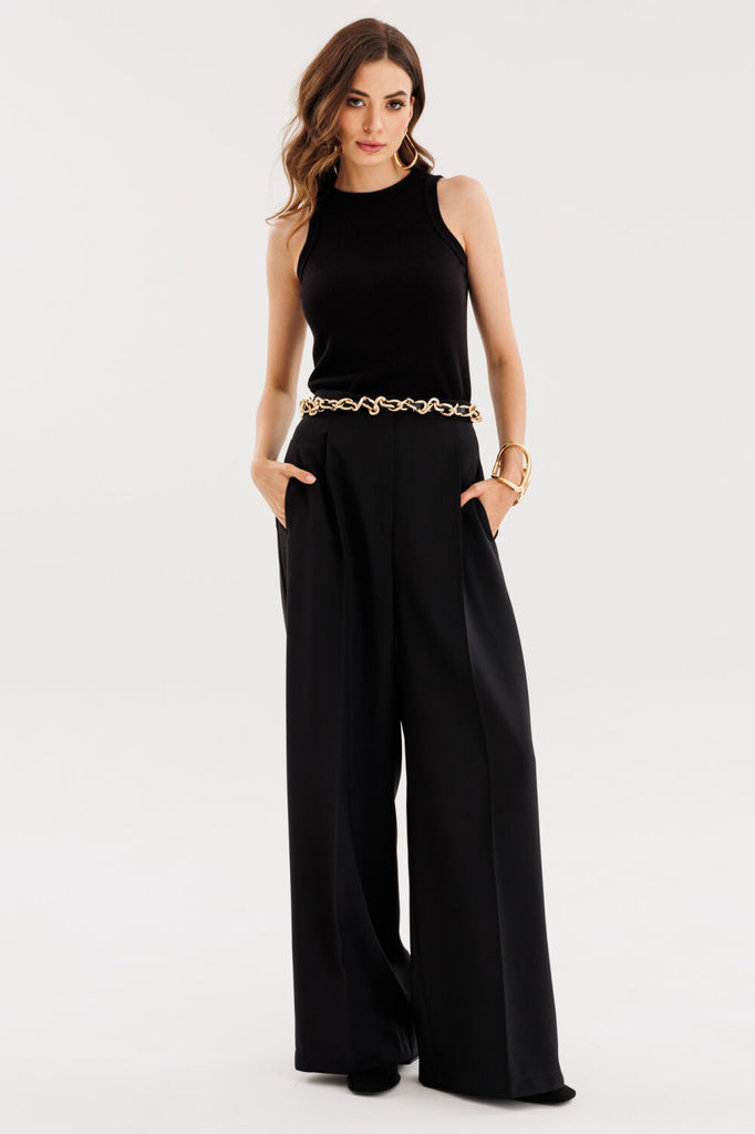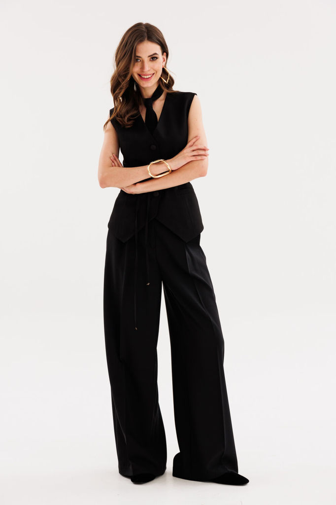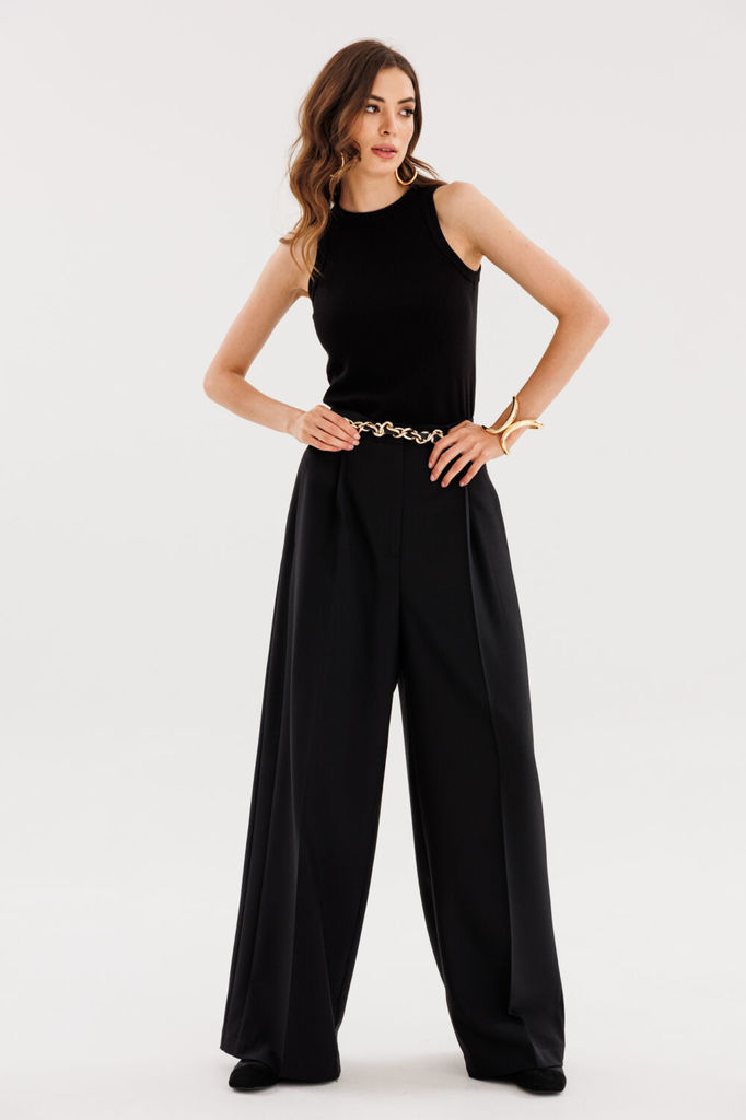 Состав: ПЭ-96%; ПУ-4%; Брюки выполнены из костюмной ткани. Брюки слегка заужены книзу. В наружных боковых швах выполнены разрезы. Карманы в боковых швах. Застежка спереди на молнию. Пояс широкий со ш... Показать описаниелевками. Съемный пояс с обтяжной пряжкой идет в комплекте. Длина брюк с поясом: р.44-48 - 106 см, р.50-54 - 108,5 см.