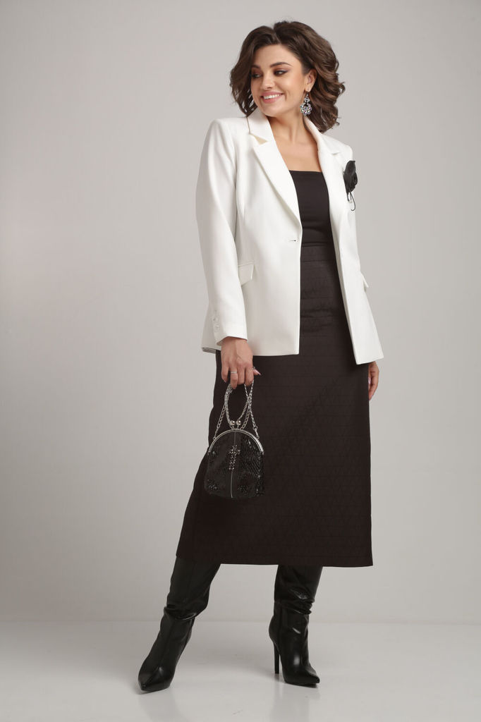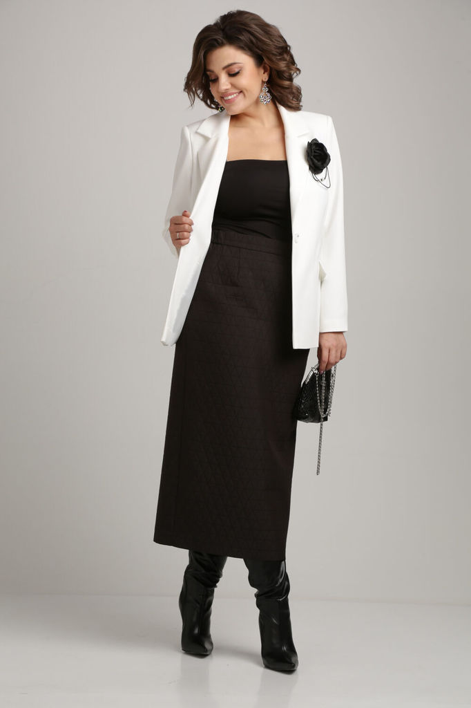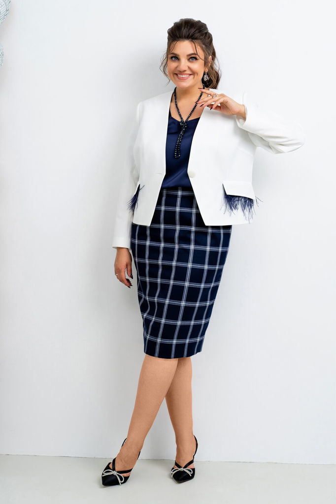 Состав: Жакет- ПЭ-95%; Спандекс-5%; Юбка- Вискоза-21%; ПЭ-70%; Лён-9%; Сезон: Осень-Зима Рост: 164 Страна бренда: Беларусь Состав: Жакет: ПЭ-95%; Спандекс-5%; Юбка: Вискоза-21%; ПЭ-70%; Лён-9%; Компле... Показать описаниект женский с современным взглядом на классику, состоящий из жакета и юбки. Жакет, выполненный в светло-молочном цвете с отделкой в актуальном дизайне, гусиная лапка. Стиль «шанель», создает роскошный, утонченный образ. Жакет на подкладке с застежкой на петли и пуговицы, горловина округлой формы, с нагрудными вытачками. По переду настрочные листочки и карманы с застёжкой на петлю и пуговицу. Спинка цельная, без особенностей. Рукав втачной, одношовный, длинный с мандетой по низу. Юбка слегка зауженная к низу с поясом. В поясе по бокам для максимального комфорта предусмотрена резинка. Застёжка по спинке на молнию в среднем шве. В среднем шве по низу отлетная шлица. Юбка на подкладке. Костюм особенно хорошо тем, что верх и низ можно носить по отдельности создовая новые образы. Длина жакета 54 см, длина рукава 61 см, длина юбки 68см.