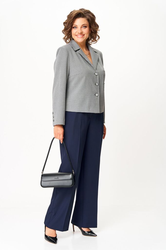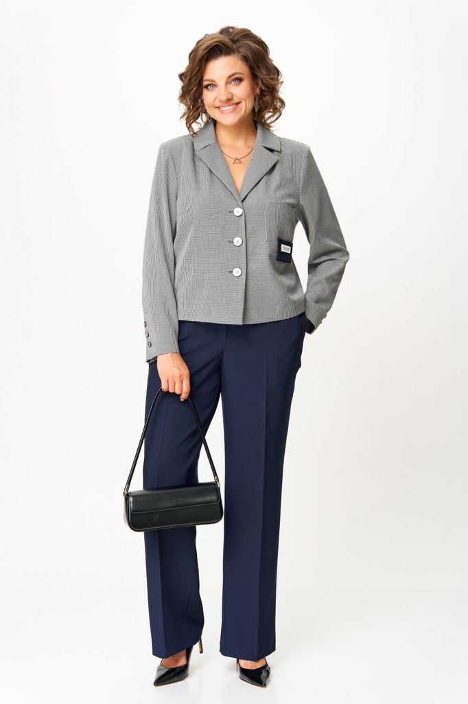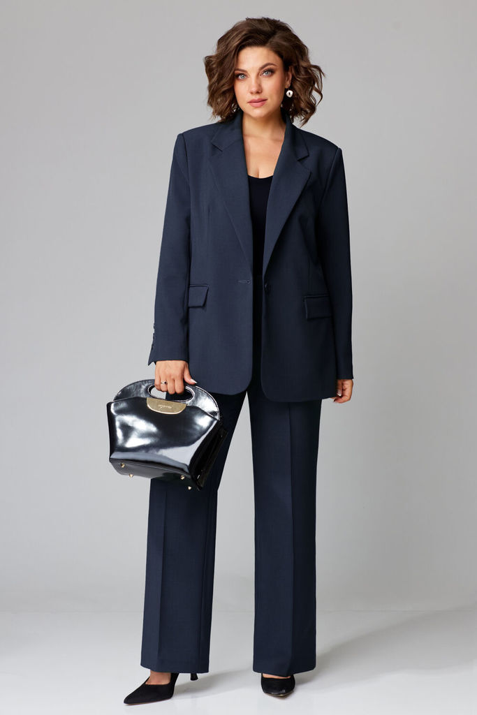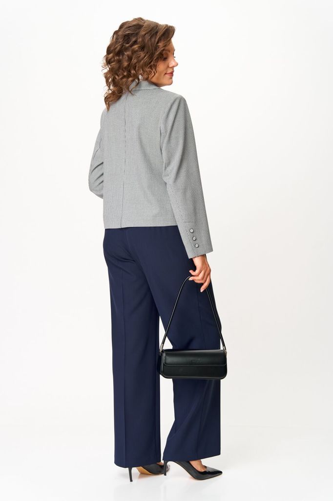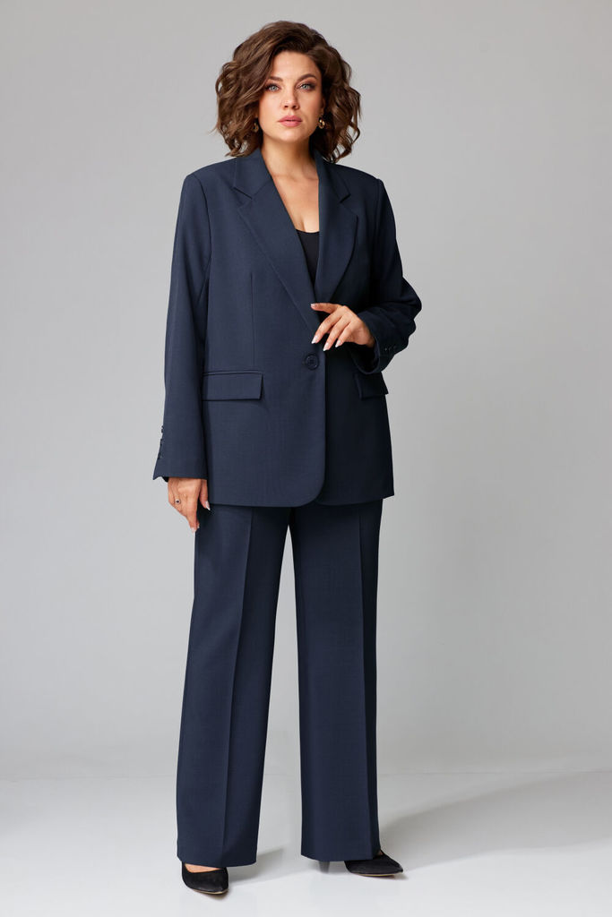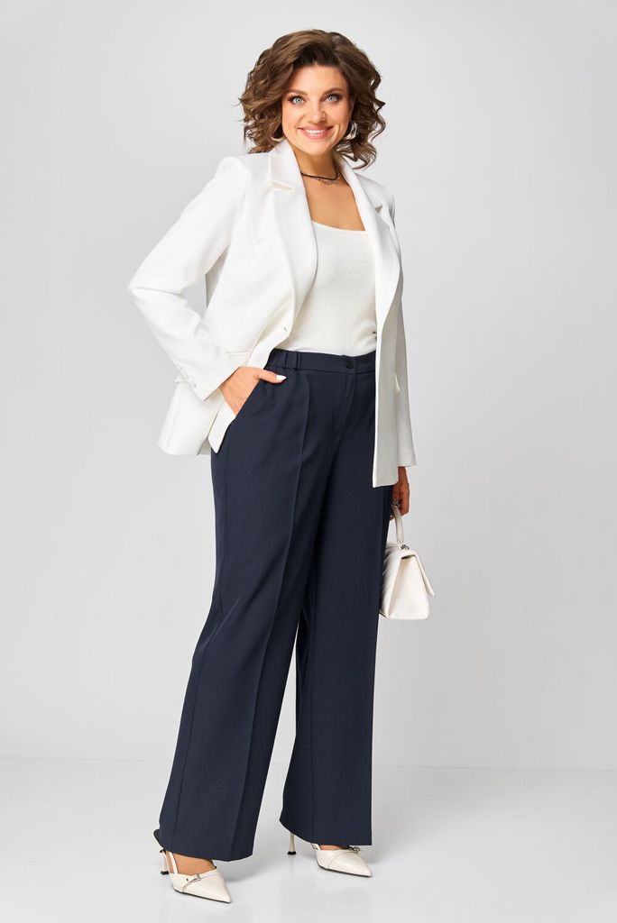 Состав: Вискоза-25%; ПЭ-73%; Эластан-2%; Сезон: Осень-Зима Рост: 164 Страна бренда: Беларусь Состав: Вискоза-25%; ПЭ-73%; Эластан-2%; Комплект идеально подходит для офиса, деловых переговоров или свет... Показать описаниеских встреч, где важно подчеркнуть уверенность и вкус. Лаконичный крой, благородные оттенки и безупречный баланс строгих и женственных деталей делают этот ансамбль универсальным выбором для стильной женщины. Жакет слегка притален, удлиненный, с центральной застежкой на 1 петлю и пуговицу, с воротником пиджачного типа. Низ бортов прямой. По переду бочек и функциональные карманы с клапаном. Спинка со средним швом без особенностей. Рукава втачные, двухшовные декорированные пуговицами и шлицей. Брюки прямого силуэта с заутюженными стрелками и притачным поясом. Для максимально комфортной посадки по бокам пояса вставлена эластичная резинка. Застёжка на молнию с гульфиком и пуговица по поясу. По переду в боковых швах карманы. Задние половинки брюк с талевыми вытачками. Этот образ — воплощение современного стиля деловой женщины. Молочный жакет с тонким синим поясом подчеркивает фигуру и добавляет изысканной строгости. Контрастные тёмно-синие брюки вытягивают силуэт, делая его более стройным и элегантным.