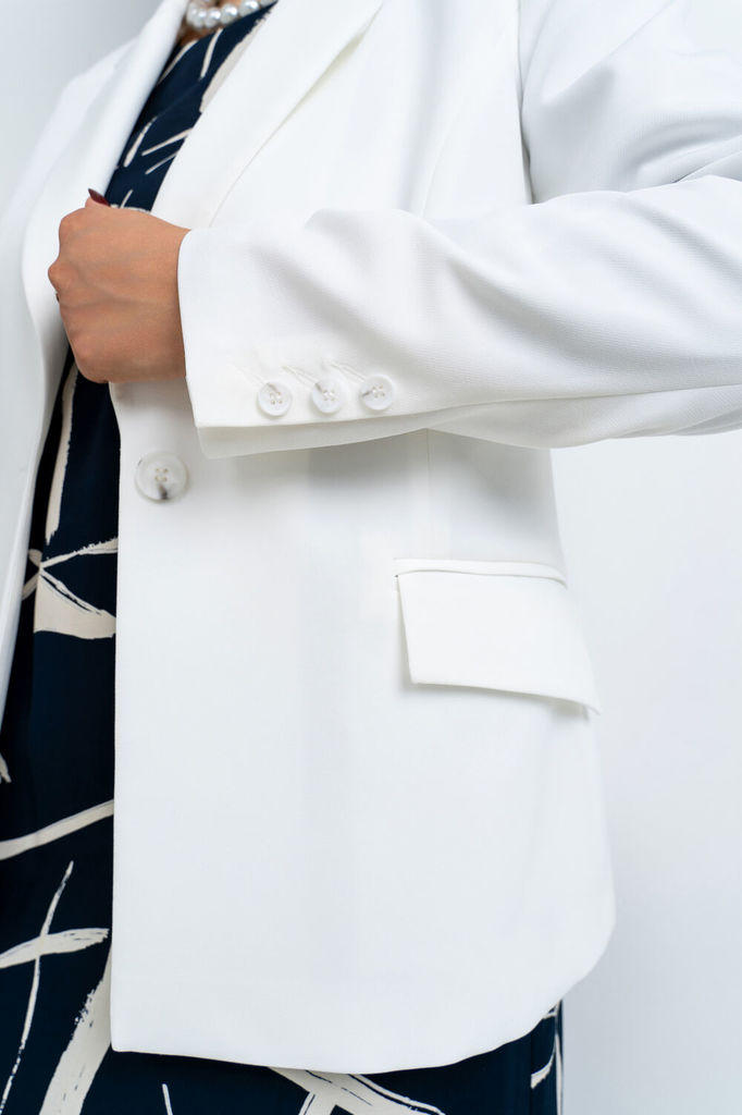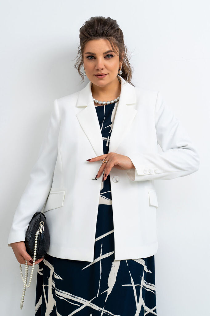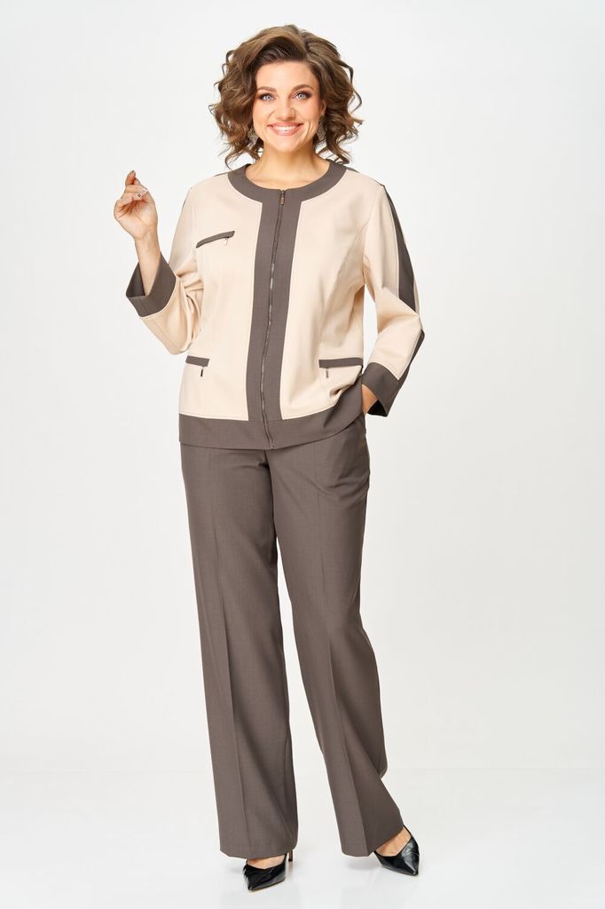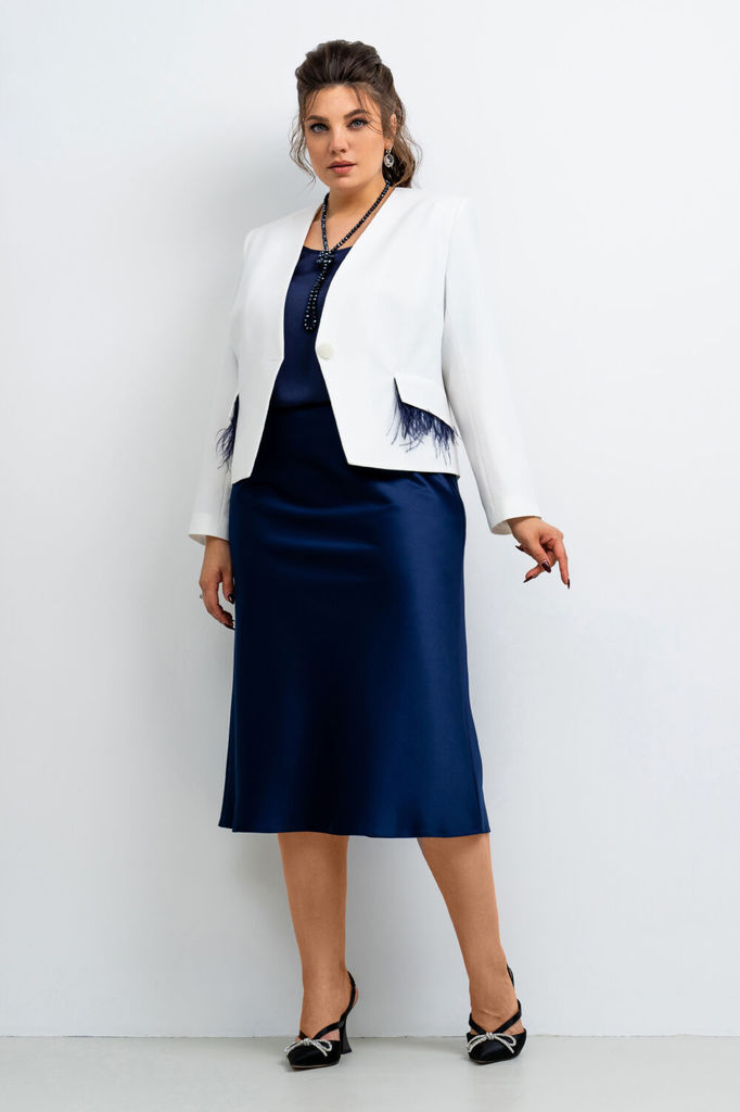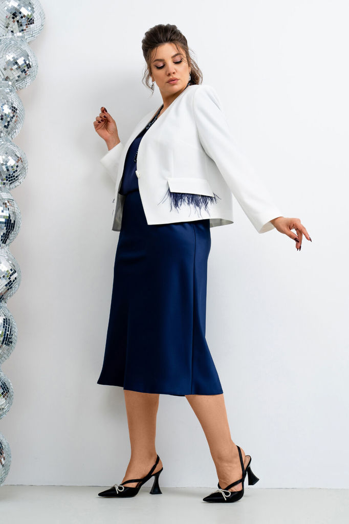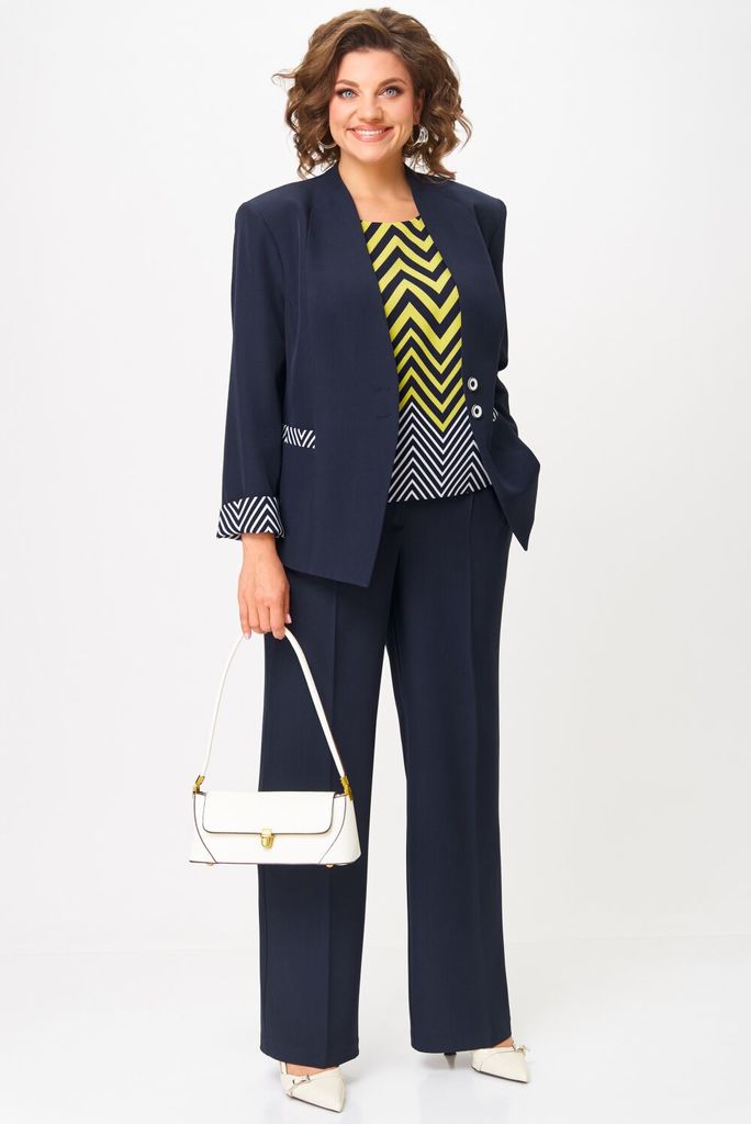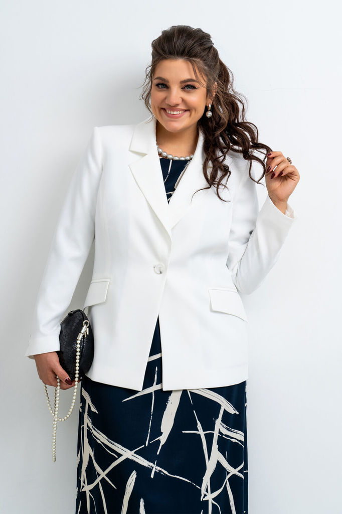 Состав: Вискоза-25%; ПЭ-73%; Эластан-2%; Сезон: Осень-Зима Рост: 164 Страна бренда: Беларусь Состав: Вискоза-25%; ПЭ-73%; Эластан-2%; Комплект идеально подходит для офиса, деловых переговоров или свет... Показать описаниеских встреч, где важно подчеркнуть уверенность и вкус. Лаконичный крой, благородные оттенки и безупречный баланс строгих и женственных деталей делают этот ансамбль универсальным выбором для стильной женщины. Жакет слегка притален, удлиненный, с центральной застежкой на 1 петлю и пуговицу, с воротником пиджачного типа. Низ бортов прямой. По переду бочек и функциональные карманы с клапаном. Спинка со средним швом без особенностей. Рукава втачные, двухшовные декорированные пуговицами и шлицей. Брюки прямого силуэта с заутюженными стрелками и притачным поясом. Для максимально комфортной посадки по бокам пояса вставлена эластичная резинка. Застёжка на молнию с гульфиком и пуговица по поясу. По переду в боковых швах карманы. Задние половинки брюк с талевыми вытачками. Этот образ — воплощение современного стиля деловой женщины. Молочный жакет с тонким синим поясом подчеркивает фигуру и добавляет изысканной строгости. Контрастные тёмно-синие брюки вытягивают силуэт, делая его более стройным и элегантным.