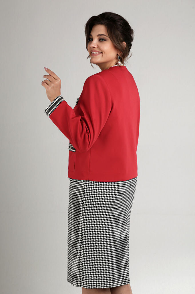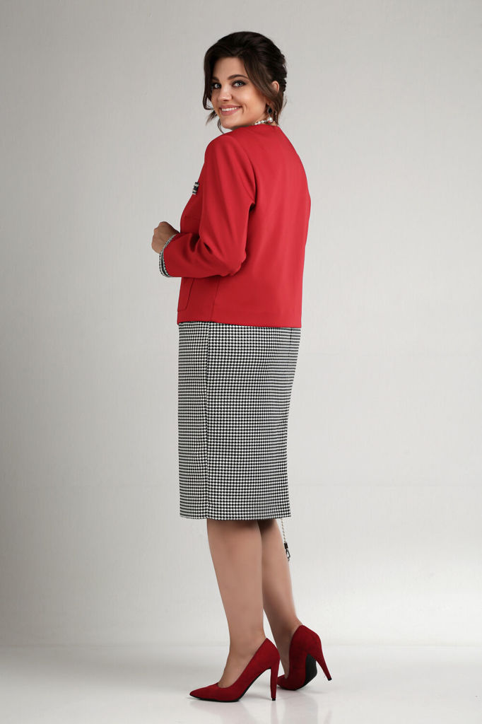 Состав: Жакет- Вискоза-25%; ПЭ-73%; Эластан-2%; Юбка- Вискоза-33%; ПЭ-64%; Спандекс-3%; Сезон: Осень-Зима Рост: 164 Страна бренда: Беларусь Состав: Жакет: Вискоза-25%; ПЭ-73%; Эластан-2%; Юбка: Вискоз... Показать описаниеа-33%; ПЭ-64%; Спандекс-3%; Комплект женский двухпредметный, состоит из жакета и юбки. Жакет слегка притален, удлиненный, с центральной застежкой на 1 петлю и пуговицу, с воротником пиджачного типа. Низ бортов прямой. По переду бочек и функциональные карманы с клапаном. Спинка со средним швом без особенностей. Рукава втачные, двухшовные декорированные пуговицами и шлицей. Юбка прямая длиной миди из ткани с геометрическим рисунком из ткани жаккардового переплетения. По заднему полотнищу юбки шов с застежкой потайная молния и разрезом по низу. Для максимально комфортной посадки по бокам пояса вставлена эластичная резинка. Длина жакета 68 см, длина рукава 60 см, длина юбки 89 см.