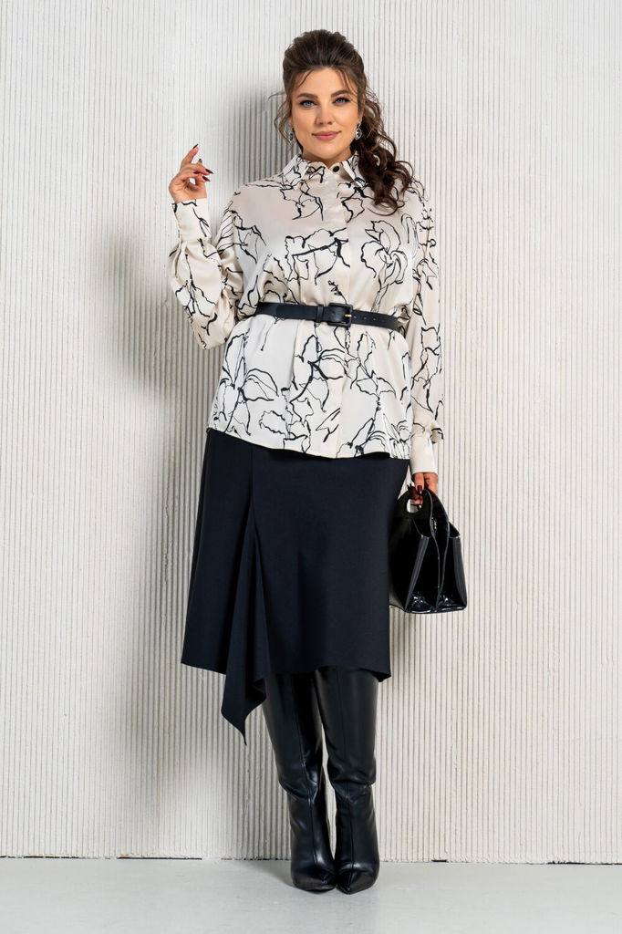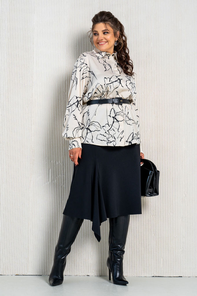 Состав: Блуза- ПЭ-100%; Юбка- Вискоза-25%; ПЭ-73%; Эластан-2%; Сезон: Осень-Зима Рост: 164 Страна бренда: Беларусь Состав: Блуза: ПЭ-100%; Юбка: Вискоза-25%; ПЭ-73%; Эластан-2%; Сдержанная модель, под... Показать описаниечеркивающая женственность и характер состоящая из блузки и юбки. Универсальная блузка-рубашка прямого силуэта с необычным контрастным принтом, в котором Вы будете чувствовать себя неотразимой. Блузка прямого силуэта с центральной застёжкой на потайную планку с пуговицами 8шт . Вырез горловины оформлен отложным воротником со стойкой. Спинка без особенностей. Линия плеча слегка спущенная. Рукав втачной длинный с манжетой по низу. Застежка манжеты на 2-е петли и пуговицы. Юбка А-образного силуэта с углом по переду и притачным поясом с эластичной тесьмой по спинке. Юбка без подкладки. Застежка на потайную молнию в боковом шве, длина молнии 17см. Отличный вариант для повседневных и нарядных луков, который можно смело комбинировать с другими вещами. В боковом шве юбки застёжка на потайную молнию и пуговицу в поясе. Длина блузки 75см, длина рукава от горловины 83 см. Длина юбки 75см