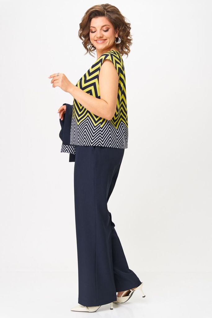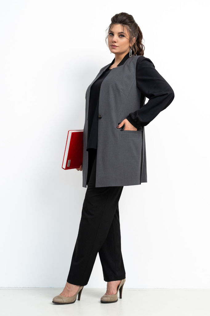 Состав: Блуза- ПЭ-100%; Брюки- Вискоза-40%; ПЭ-40%; Лён-20%; Сезон: Осень-Зима Рост: 164 Страна бренда: Беларусь Состав: Блуза: ПЭ-100%; Брюки: Вискоза-40%; ПЭ-40%; Лён-20%; Оригинальный женский компл... Показать описаниеект тройка в классическом стиле - идеальный вариант для офиса. Практичный и элегантный комплект поможет создать образ, который будет отлично смотреться на любом типе фигуры. Жилетка прямого силуэта, с застёжкой на 1 петля и пуговицу. Воротник стойка; по переду жилетки отделочные клапана, и функциональные карманы в рамку. Спинка жилетки со средним швом и шлицей по низу. Жилетка без подкладки. Блузка прямого силуэта с округлой горловиной, нагрудными вытачками и разрезами в боковых швах. Рукава втачные с манжетой по низу. Брюки прямого силуэта, длинные с притачным поясом и вставкой резинки по бокам, которая обеспечивает максимально комфортную посадку на любой тип фигуры. В боковых швах брюк карманы. Длина жилетки 83 см, длина блузки 65 см, длина рукава 64 см, длина брюк 107 см.