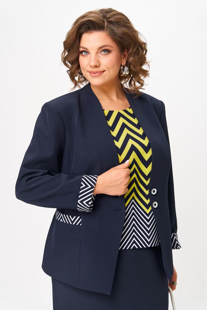 Состав: Блуза- Вискоза-35%; ПЭ-62%; Эластан-3%; Костюм- Вискоза-32%; ПЭ-65%; Эластан-3%; Сезон: Осень-Зима Рост: 164 Страна бренда: Беларусь Состав: Блуза: Вискоза-35%; ПЭ-62%; Эластан-3%; Костюм: Вис... Показать описаниекоза-32%; ПЭ-65%; Эластан-3%; Элегантный женский костюм тройка. Жакет полуприлегающего силуэта на подкладке с цельнокроеной стойкой и центральной застежкой на две петли и пуговицы. По переду фигурные рельефы выходящие из горловины и карманы. Рукав двухшовный с манжетой по низу. Жакет декорирован отделочной тканью по низу рукава и карманам. Юбка классическая на подкладке, слегка зауженная к низу. В среднем шве заднего полотнища застежка потайная молния и шлица по низу. Для максимально комфортной посадки по бокам пояса вставлена эластичная резинка. Блузка с контрастным рисунком и округлым вырезом горловины. По переду нагрудные вытачки, линия плеча спущенная.