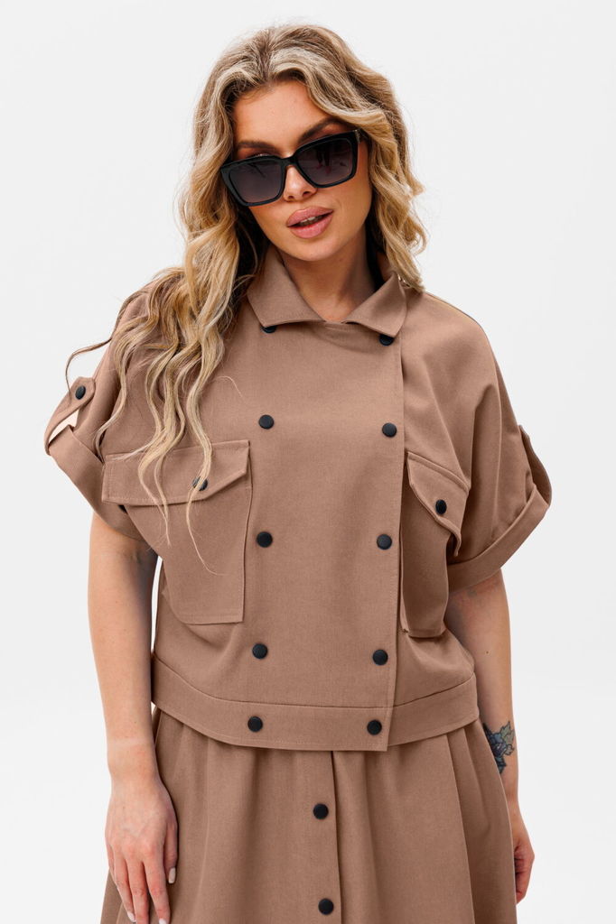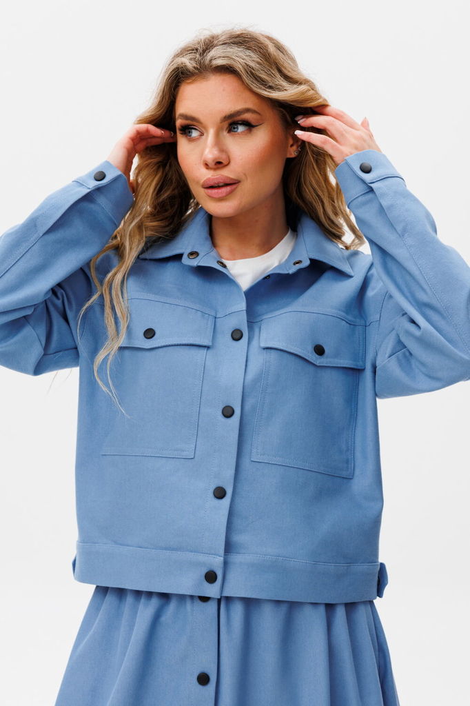 Сезон: Весна Рост: 170 Страна бренда: Беларусь Состав: верх: 100% ПЭ, основа 95% Хлопок 5% Эластан. Экокожа. Жакет укороченный  полуприлегающего силуэта. По переду нагрудная вытачка, переходящая ... Показать описаниев прорезной карман с клапаном. Двухбортная застёжка на петли-пуговицы. Рукав двухшовный, на логтевом шве отлетная шлица.