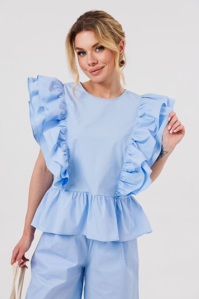 Состав: ПЭ-100%; Сезон: Лето Рост: 170 Страна бренда: Беларусь Состав: ПЭ-100%; Блузка женская свободного силуэта с застежкой по переду на пуговицы. По переду блузки и по рукавам  декоративные воланы.