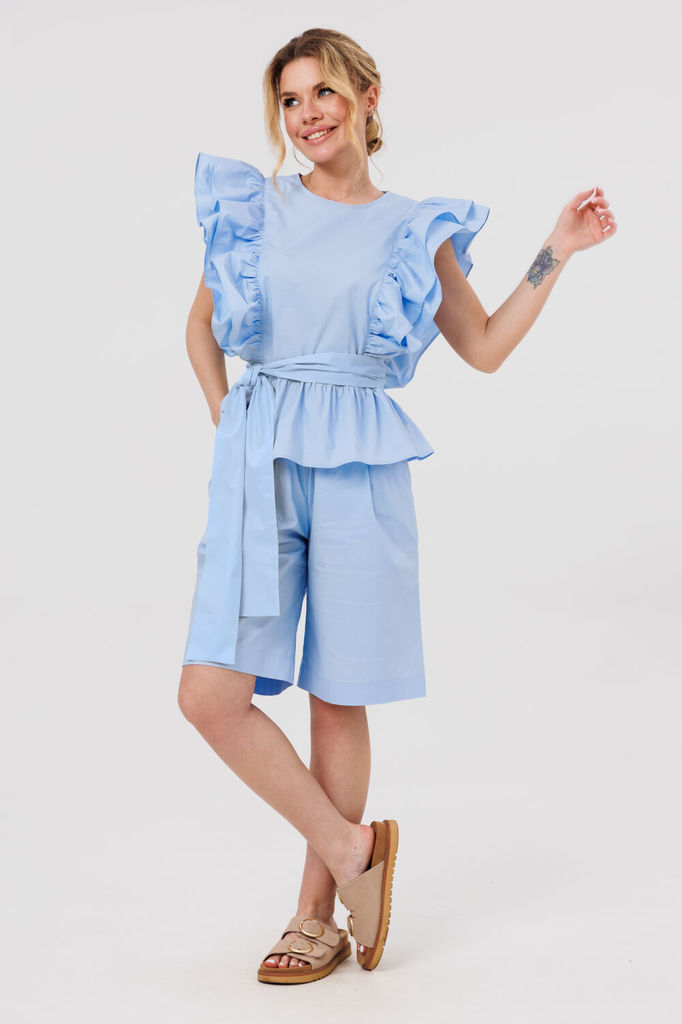 Состав: Хлопок-100%; Сезон: Лето Рост: 170 Страна бренда: Беларусь Состав: Хлопок-100%; Блузка женская свободного силуэта, с рюшей по линии талии. По переду и спинке лифа рельефы с двумя притачными рю... Показать описаниешами. По спинке вырез "Капелька" с застежкой на кнопку. Сьемный пояс в комлекте.