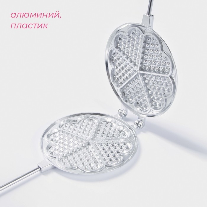 Форма для выпечки изготовлена из прочного литого алюминия. Она отлично подойдёт для приготовления вкусного десерта, ставшего советской классикой. Нежные вафли порадуют ваших гостей и домочадцев. Повер... Показать описаниехность диаметром 18 см разделена на 5 одинаковых по размеру ячеек. Благодаря эргономичным пластиковым ручкам форму легко переворачивать в процессе готовки.