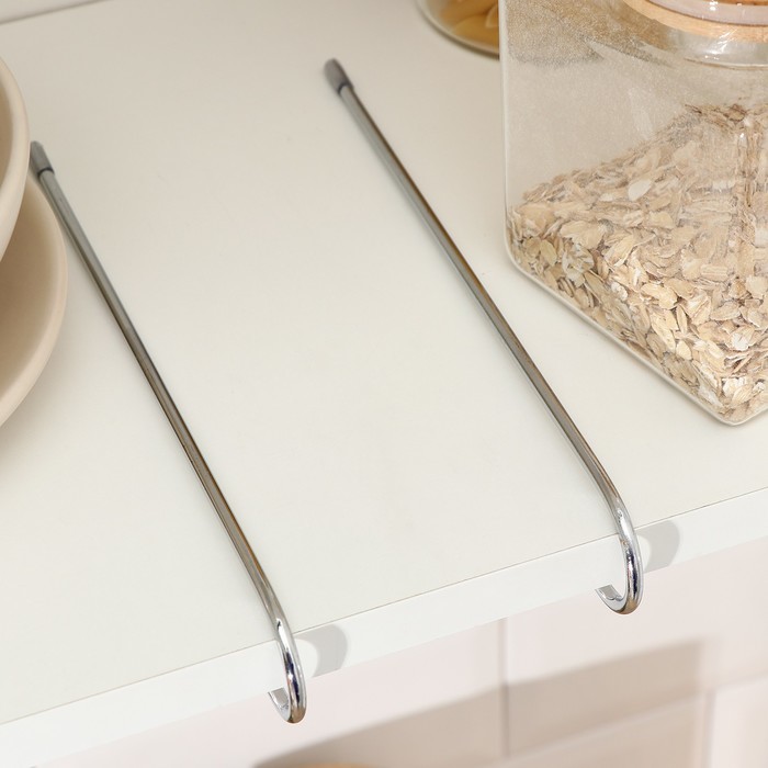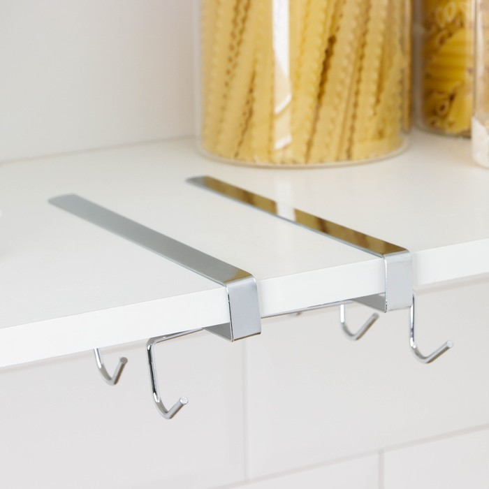 Удобный держатель предназначен для экономии места на кухне, а именно компактного хранения полотенец в одном месте. Преимущества: * Универсальный подвесной держатель помогает решить проблему с ограниче... Показать описаниенным количеством мест хранения, эффективно использовать пространство в доме. * Держатель можно использовать для хранения кружек, а также для полотенец, благодаря удобным крючкам. * Изделие прочное, не гнётся, не окисляется. Дополнительно Для полок толщиной 1,4 см