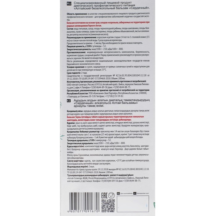 Алтайский бальзам на травах рекомендуется для нормализации работы сердечно-сосудистой системы. Средство производит мягкий гипотензивный эффект и нормализует сердечный ритм. Не содержит алкоголя, можно... Показать описание применять каждый день. Арония, боярышник, красный клевер — активные действующие травы в бальзаме. Они укрепляют сердечную мышцу и стенки кровеносных сосудов, нормализуют сердечный ритм. При постоянном применении бальзама на травах укрепляется иммунитет, улучшается в целом состояние сердечно-сосудистой системы, нормализуется уровень холестерина в крови. Состав: сахар-песок, вода питьевая, плоды рябины черноплодной (аронии), плоды шиповника, плоды боярышника, трава красного клевера, трава пустырника, плоды рябины обыкновенной, листья земляники, регулятор кислотности (лимонная кислота). Рекомендации по применению: добавляйте по 1–2 чайной ложки на стакан воды, чая, сока, минеральной воды, молока, другого напитка или употребляйте в чистом виде 2–3 раза в день. Условия хранения: держите в сухом, защищённом от света месте при температуре не выше 25 °C. Срок годности: 24 месяца. Объём: 200 мл. Не является лекарством.
