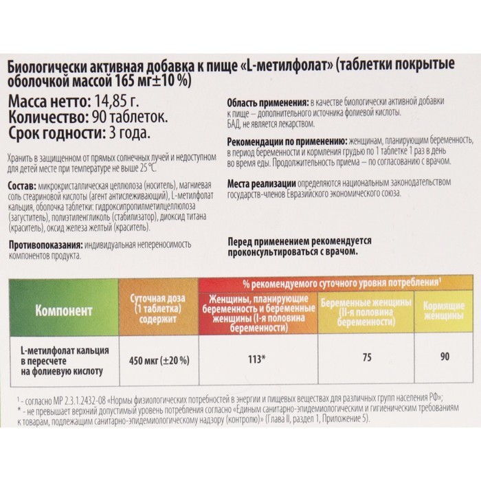 L-МЕТИЛФОЛАТ - Биологически активная добавка (БАД) к пище - биологически активная форма фолиевой кислоты, которая при поступлении в организм минует множественные химические превращения. Суточная доза ... Показать описание(1 таблетка) содержит: L-метилфолат кальция, в пересчете на фолиевую кислоту 450 мкг (±20 %) Питание женщины играет очень важную роль не только в ее собственном здоровье, но и в здоровье ее будущего малыша, из-за чего женщине желательно придерживаться диеты с дополнительным источником фолатов для организма. Добавление L-метилфолата к обычному рациону будет полезно беременным или планирующим беременность женщинам, так как его употребление способ- ствует процессу формирования ткани плаценты, через которую осуществляется передача кислорода, энергии и всех остальных питательных веществ от матери к плоду. Информация о биологически активных веществах и их свойствах: L-метилфолат участвует в процессе кроветворения, во время беременности принимает участие в формировании ткани плаценты и кровеносных сосудов матки, поэтому у беременных женщин повышается потребность в фолатах. Они являются необходимыми веществами для репликации ДНК, синтеза аминокислот и метаболизма витаминов. L-метилфолат участвует в превращении гомоцистеина в метионин. Это превращение имеет большое значение для организма, так как гомоцистеин в больших ко- личествах обладает токсическими свойствами. При его накоплении в организме страдает, прежде всего, сердечно-сосудистая система. Метионин, в свою очередь, является полезным веществом, которое участвует в синтезе белков и ДНК, а также обеспечивает защиту последней от мутаций. L-метилфолат используется организмом в качестве кофактора (помощника) для модификации таких гормонов, как серотонин, дофамин и норадреналин, которые являются нейромедиаторами и участвуют в регуляции настроения.