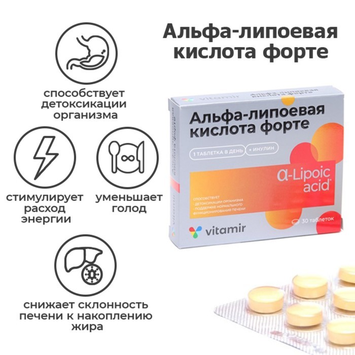 Альфа-липоевая кислота - это биологически активная добавка (БАД) к пище, которая содержит альфа-липоевую кислоту. Альфа-липоевая кислота: участвует в регуляции углеводного обмена, способствует регуляц... Показать описаниеии уровня сахара в крови, снижению аппетита и похудению. Стимулирует жировой обмен и ускоряет жиросжигание, помогая сбросить лишний вес и улучшить рельеф тела. Способствует выведению и защите клеток печени от токсинов и тяжелых металлов Detox эффект. Поддерживает здоровье и препятствует развитию жировой дистрофии печени. Обладает антиоксидантным действием, предохраняет организм от окислительного стресса, замедляя процессы старения организма - Anti-age эффект. Повышает уровень энергии и работоспособность, ускоряет восстановление после физических нагрузок. Взрослым по 1 капсуле 1 раз в день во время еды. Продолжительность приема - 1 месяц. При необходимости прием можно повторить. Перед применением рекомендуется проконсультироваться с врачом. 2 вегетарианские капсулы содержат: Альфа-липоевая кислота - 100 мг Активные компоненты: Альфа-липоевая кислота: -Участвует в регуляции углеводного обмена, способствует регуляции уровня сахара в крови, снижению аппетита и похудению. -Стимулирует жировой обмен и ускоряет жиросжигание, помогая сбросить лишний вес и улучшить рельеф тела. -Способствует выведению и защите клеток печени от токсинов и тяжелых металлов - Detox эффект. -Поддерживает здоровье и препятствует развитию жировой дистрофии печени. -Обладает антиоксидантным действием, предохраняет организм от окислительного стресса, замедляя процессы старения организма - Anti-age эффект. -Повышает уровень энергии и работоспособность, ускоряет восстановление после физических нагрузок.