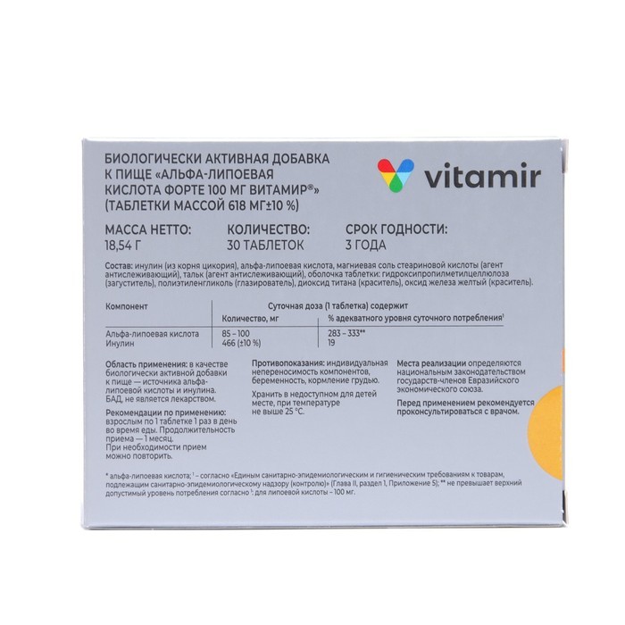 Липоевая кислота Vitamuno - Биологически активная добавка (БАД) к пище - источник липоевой кислоты. Рекомендуемый прием (2 табл.) Продолжительность приема 1 месяц содержит: Липоевая кислота 60 (±10 %)... Показать описание мг Липоевая кислота благотворно влияет на многие системы организма, избавляя его от свободных радикалов за счет общего антиоксидантного действия. Информация о биологически активных веществах и их свойствах: Липоевая кислота - это органическое соединение, один из важнейших компонентов системы антиоксидантной защиты человеческого организма. По характеру действия она похожа на витамины группы B. Благодаря своим сильным восстановительным свойствам липоевая кислота уменьшает потребность в витаминах C и E, предотвращая их быстрый распад. Она необходима для более быстрой утилизации углеводов, что в свою очередь приводит к улучшенному энергетическому обмену. Липоевая кислота, являясь участником процесса гликолиза, непосредственно участвует в переработке глюкозы в энергию. Кроме того, воздействуя на специальные белки-транспортеры, липоевая кислота способствует уменьшению деградации инсулина, благодаря чему происходит более эффективная утилизация глюкозы. Также она запускает процесс детоксикации в организме. Такой эффект достигается за счет связывания этой кислоты с солями тяжелых металлов с дальнейшим их выведением. Важная функция липоевой кислоты состоит в уменьшении разрушающего воздействия алкоголя на клетки печени за счет участия в реакциях обезвреживания этанола. Способ применения и дозы: Взрослым принимать по 1 таблетке 2 раза в день во время еды. Продолжительность приема - 1 месяц. При необходимости прием можно повторить. Показания: В качестве биологически активной добавки к пище - источника липоевой кислоты. Состав: Активный компоненты - Альфа-Липоевая кислота. Вспомогательные компоненты - микрокристаллическая целлюлоза, диоксид кремния, стеарат магния, гидроксипропилметилцеллюлоза, мальтодекстрин, полиэтиленгликоль, тальк, ТВИН 80, оксид железа. Противопоказания: Индивидуальная непереносимость компонентов, беременность, кормление грудью. Особые указания: Биологически активная добавка (БАД) к пище Не является лекарственным средством. Перед применением рекомендуется проконсультироваться с врачом
