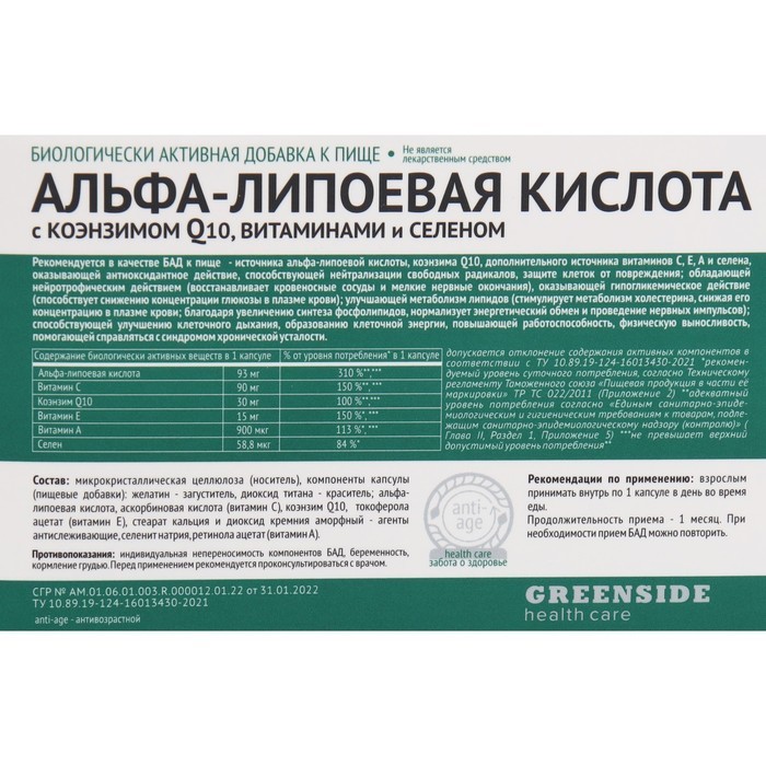 АЛЬФА-ЛИПОЕВАЯ КИСЛОТА С КОЭНЗИМОМ Q10 ВИТАМИНАМИ И СЕЛЕНОМ Альфа-липоевая предупреждает сердечно-сосудистую патологию, снижает эндотелиальную дисфункцию. АЛК эффективна при хронических заболеваниях, ... Показать описаниесвязанных с оксидативным стрессом, который присутствует и при сахарном диабете. Коэнзим Q10 (убихинон) является природным мощным иммуномодулятором, эффективно и быстро восстанавливает недостаточность функций иммунной системы, активизирует антимикробную и противовирусную защиту организма. Контролирует и снижает повышенное артериальное давление, восстанавливает и поддерживает энергетический обмен в сердечной мышце и стенке коронарных сосудов, препятствует развитию ишемической болезни сердца, коронарного артериотромбоза, инфаркта миокарда. Витамин А (Ретинол) участвует в поддержании нормального иммунитета, зрительной и репродуктивной функций организма, а также функции межклеточной коммуникации. Витамин А принимает участие в нормальном формировании и поддержании работы сердца, легких, почек и других органов. Витамин Е (Токоферол) является физиологическим антиоксидантом. Токоферол обладает противовоспалительными, антитромбоцитными и сосудорасширяющими свойствами, его также относят к кардиопротекторам. Витамин Е обладает свойствами мощного антиоксиданта, который усиливает иммунную защиту от вирусов, предотвращает в организме ведущий к воспалению окислительный стресс, способствует омоложению кожи. Витамин Е важен для поддержания нормального функционирования нервов, мышц и крови, а также способствует улучшению умственной и нервной деятельности. Селен является антиоксидантом, позволяющим снизить риск онкологических заболеваний и возникновения сердечных заболеваний. Предотвращает ухудшение умственных способностей, улучшает работу щитовидной железы и иммунной системы. Регулярное потребление селена усиливает иммунную реакцию организма, в то время как дефицит этого элемента приводит к ее замедлению.